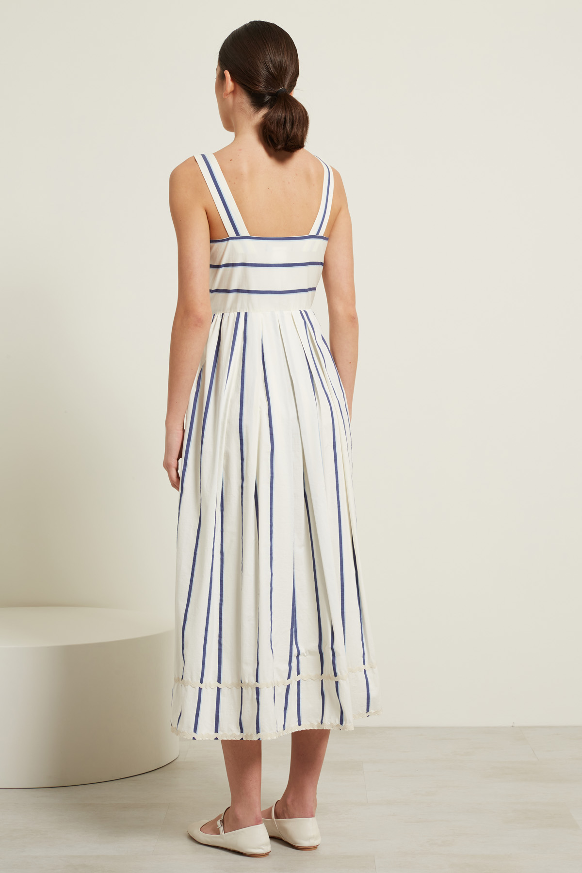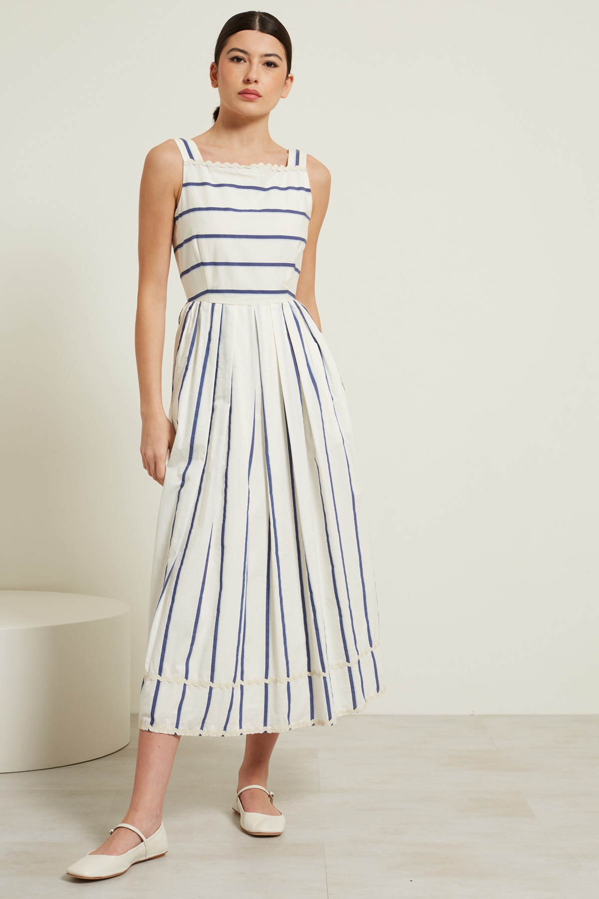 Abito lungo dalla linea svasata realizzato in popeline di misto cotone e seta, con scollo squadrato e inserti di passamanerie, spallini sottili e tasche inserite in cucitura. Allacciatura tramite zip invisibile sul fianco. Foderato.