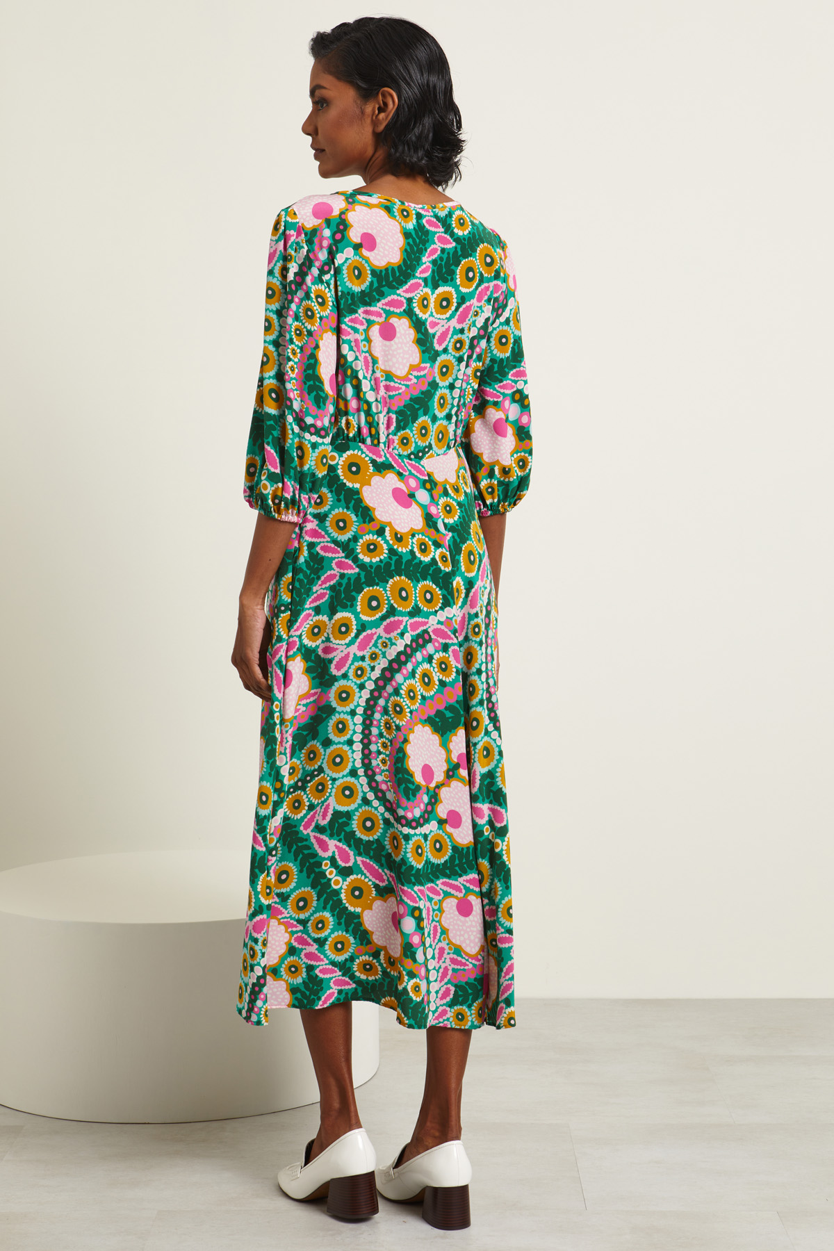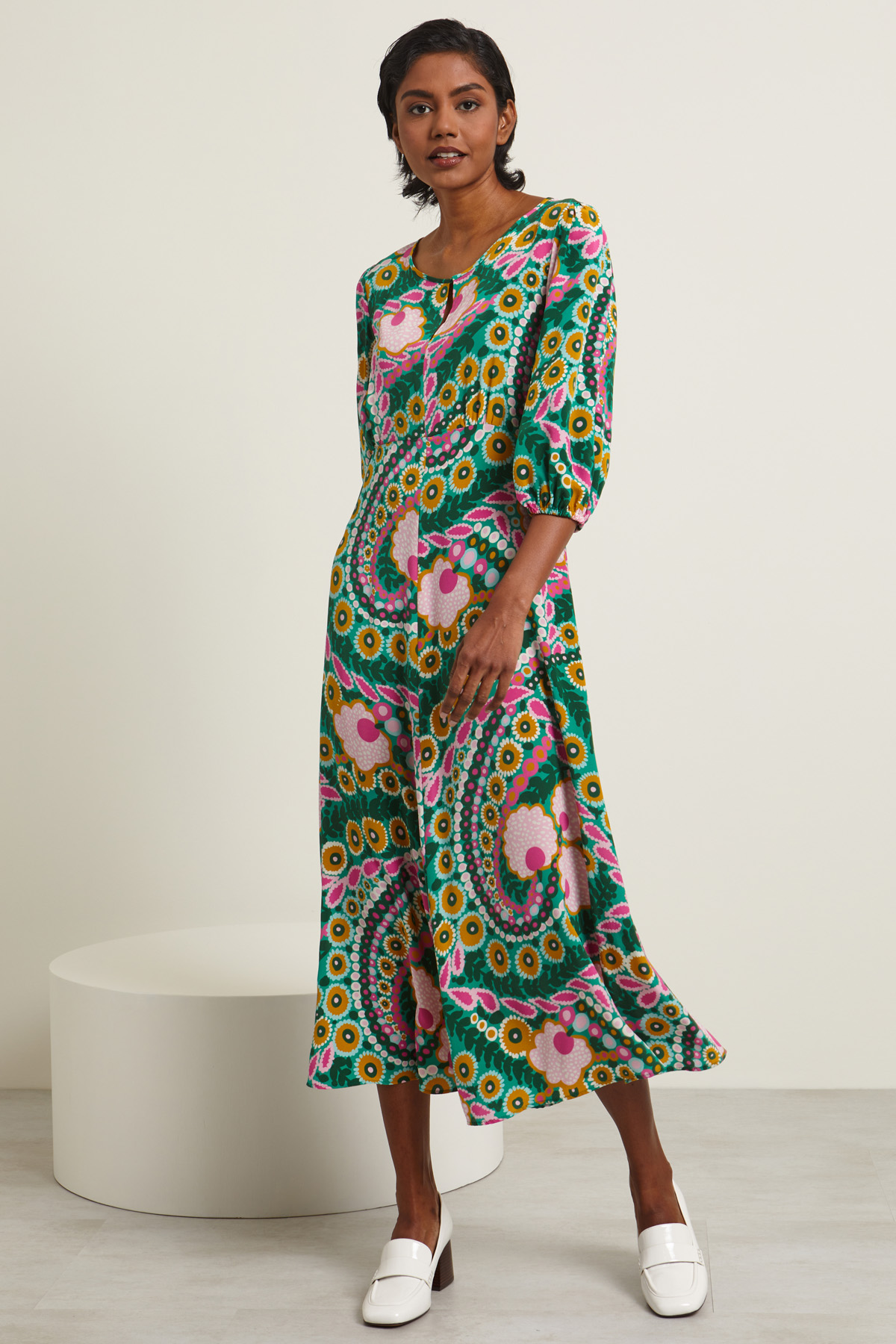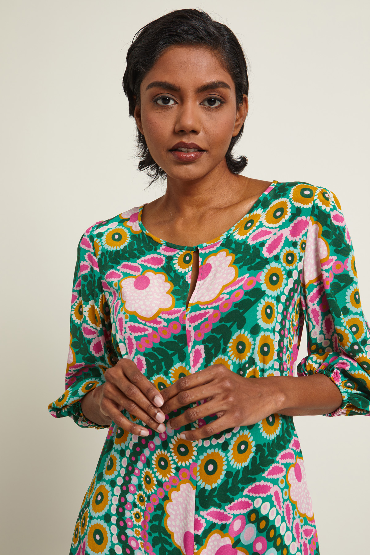 Abito lungo dalla linea fluida realizzato in crêpe de chine di pura seta stampata con scollo a giro e apertura a goccia, maniche tre quarti con inserto elastico al polsino, taglio in vita e tasche inserite in cucitura. Allacciatura tramite zip. Sfoderato.