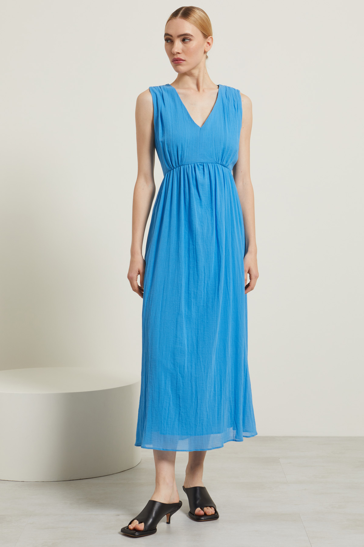 Abito smanicato stile impero realizzato in garza di puro cotone, con scollo a V e tasche inserite in cucitura. Allacciatura tramite zip sul fianco.