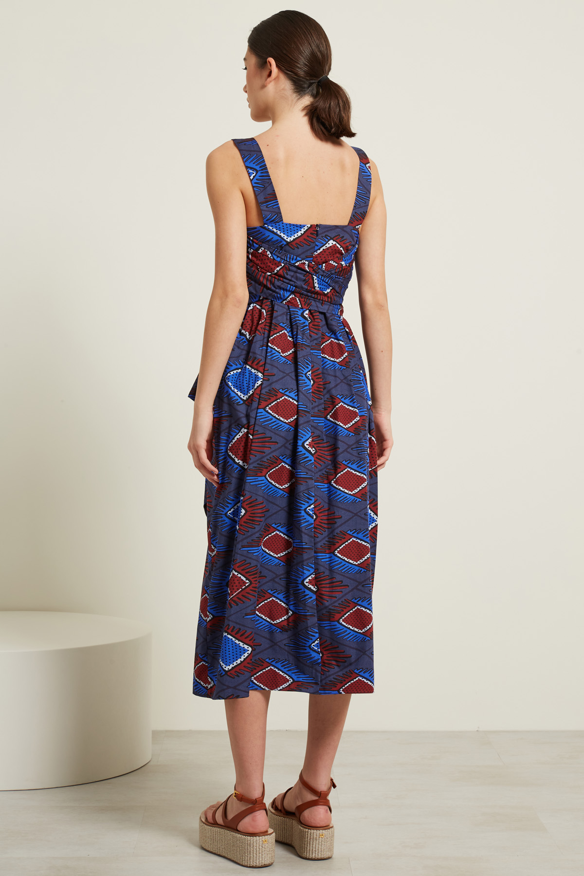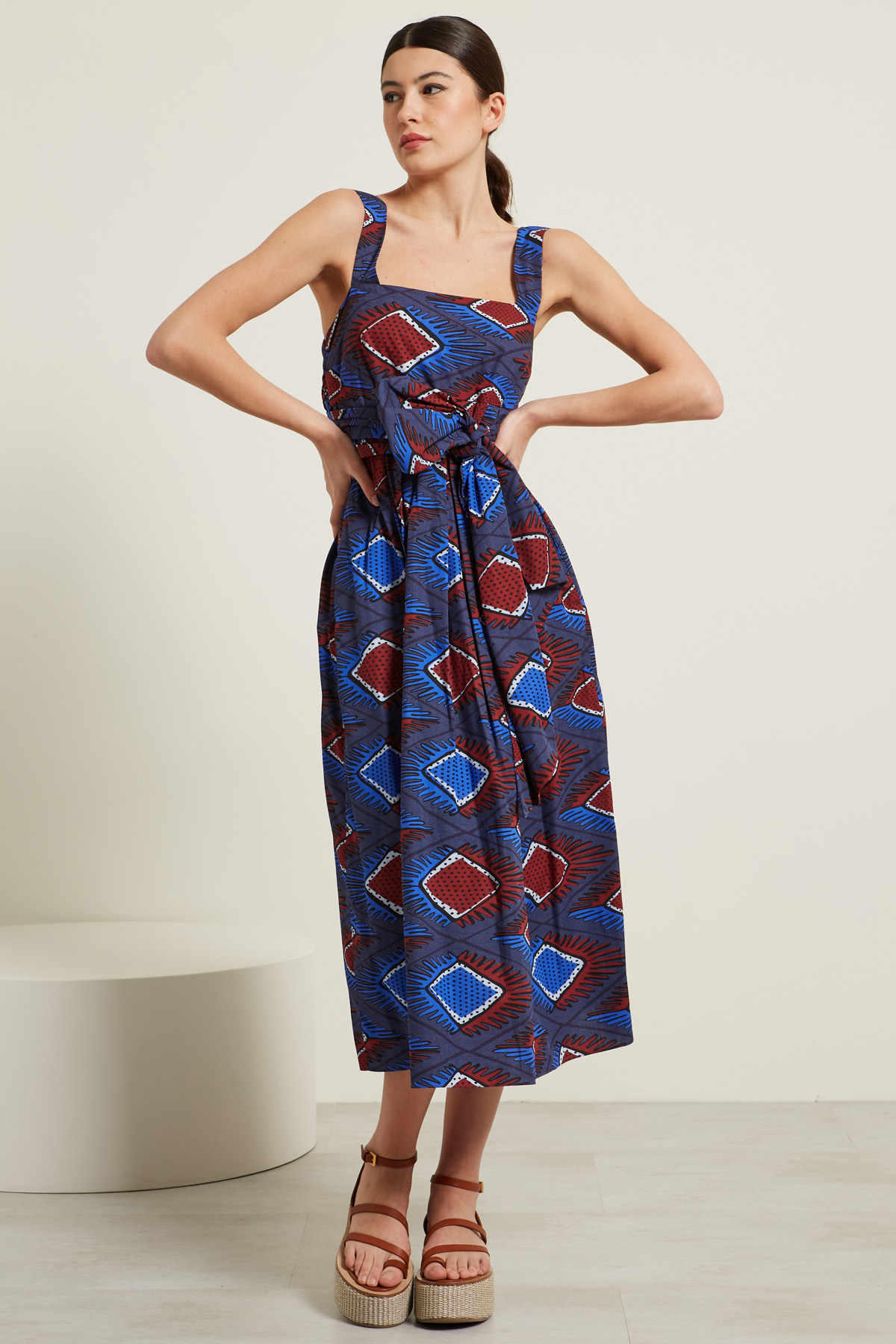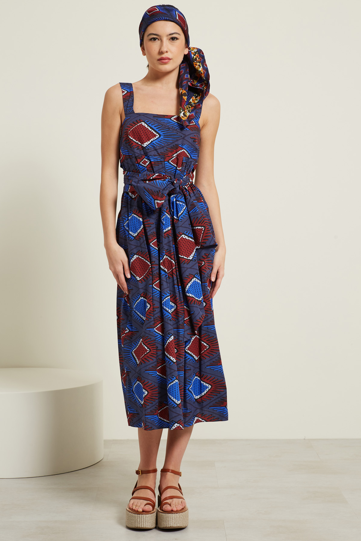 Abito dalla linea morbida realizzato in popeline di puro cotone, con scollo squadrato e spallini, taglio in vita e tasche inserite in cucitura. Allacciatura tramite zip nel retro e fusciacca da annodare. Sfoderato.