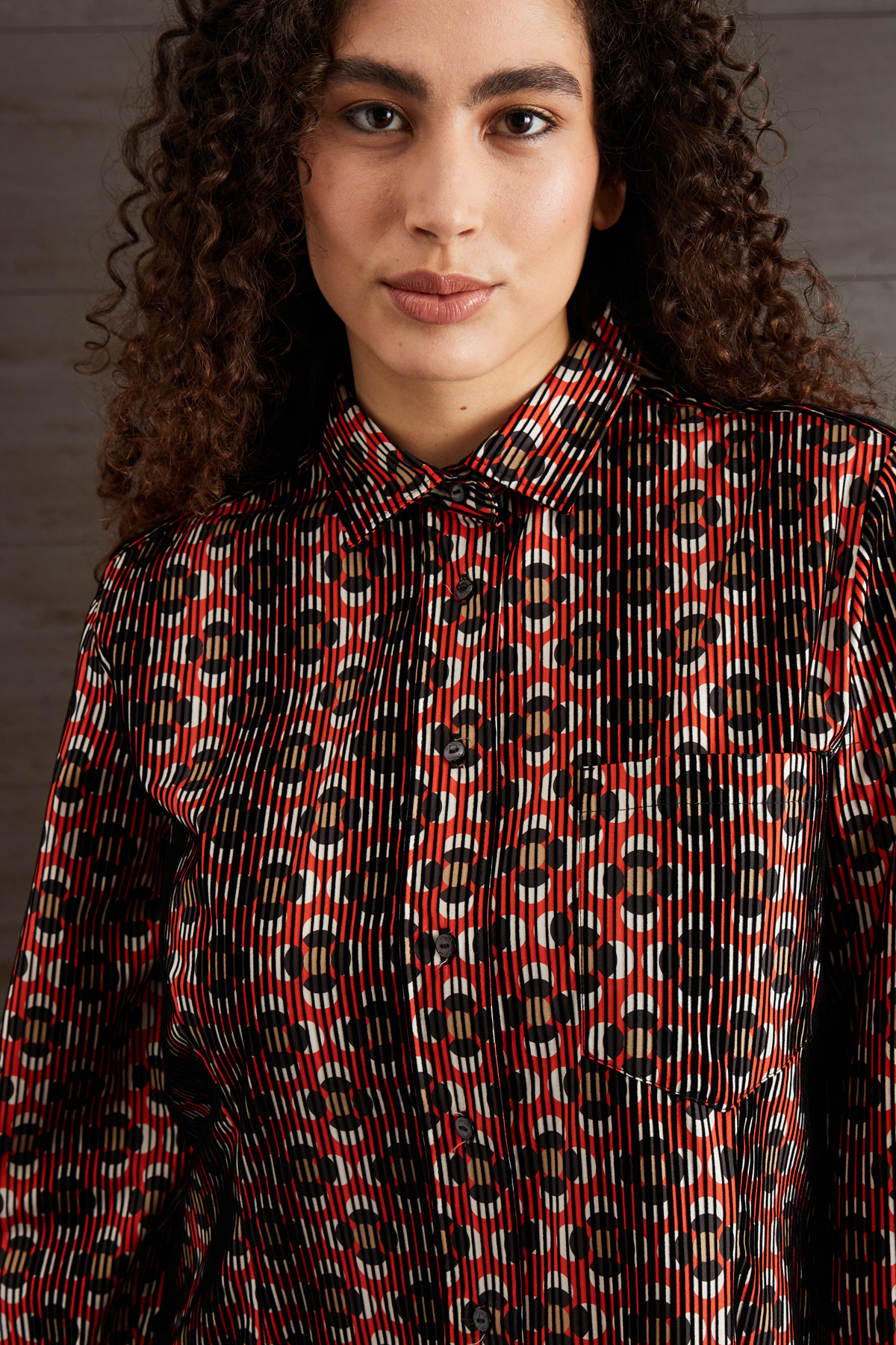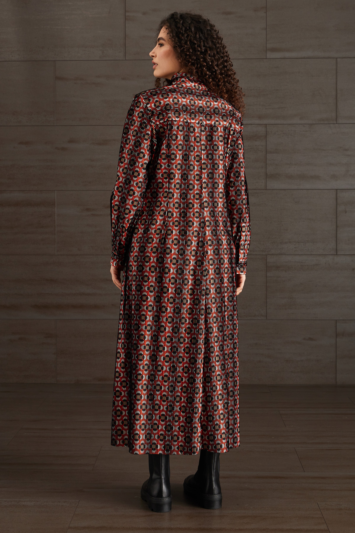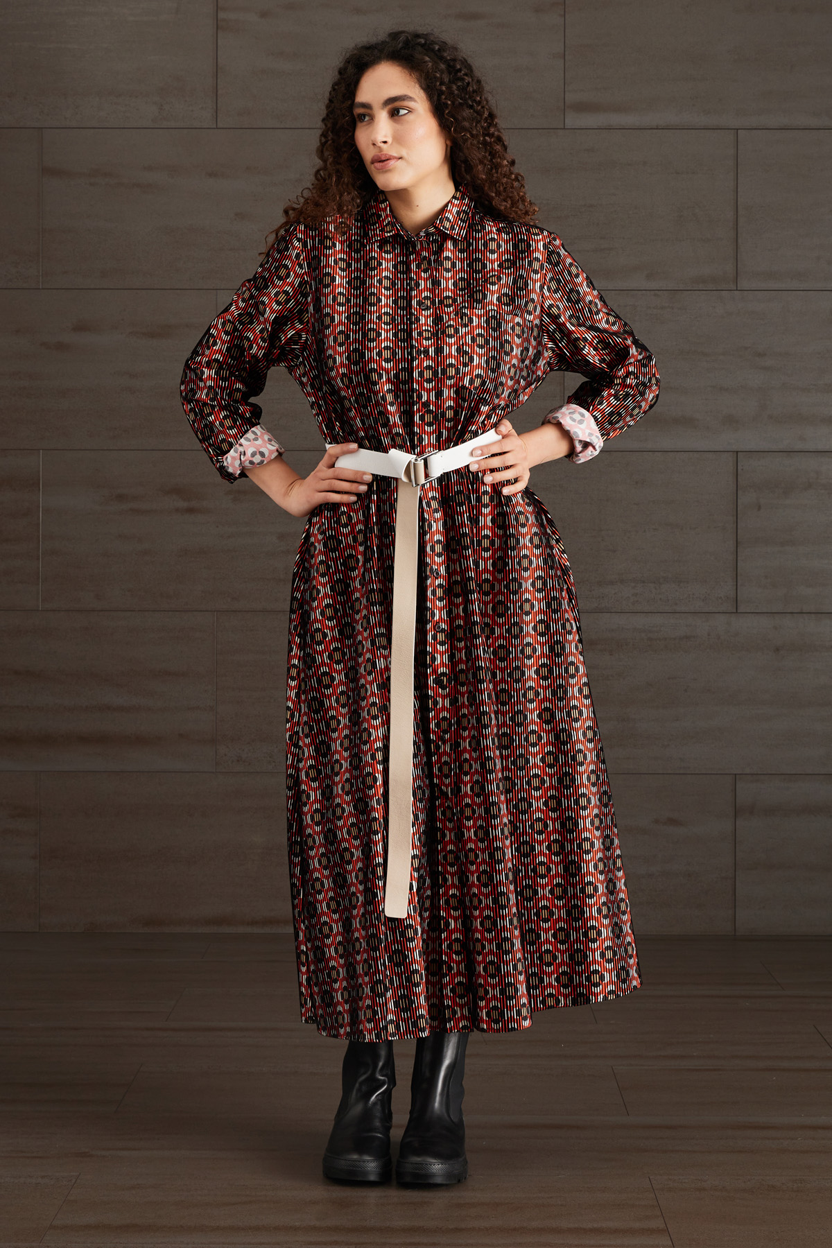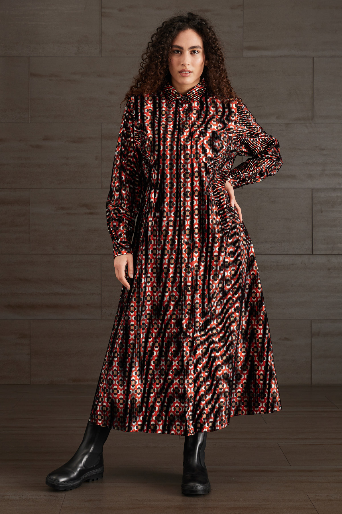 Chemisier lungo dalla linea dritta realizzato in popeline di puro cotone stampato, con lavorazione a rilievo in velluto, colletto classico, maniche lunghe con polsino e bottoni, taschino applicato al petto e tasche laterali inserite in cucitura e carrè nel retro. Allacciatura tramite bottoni a vista.