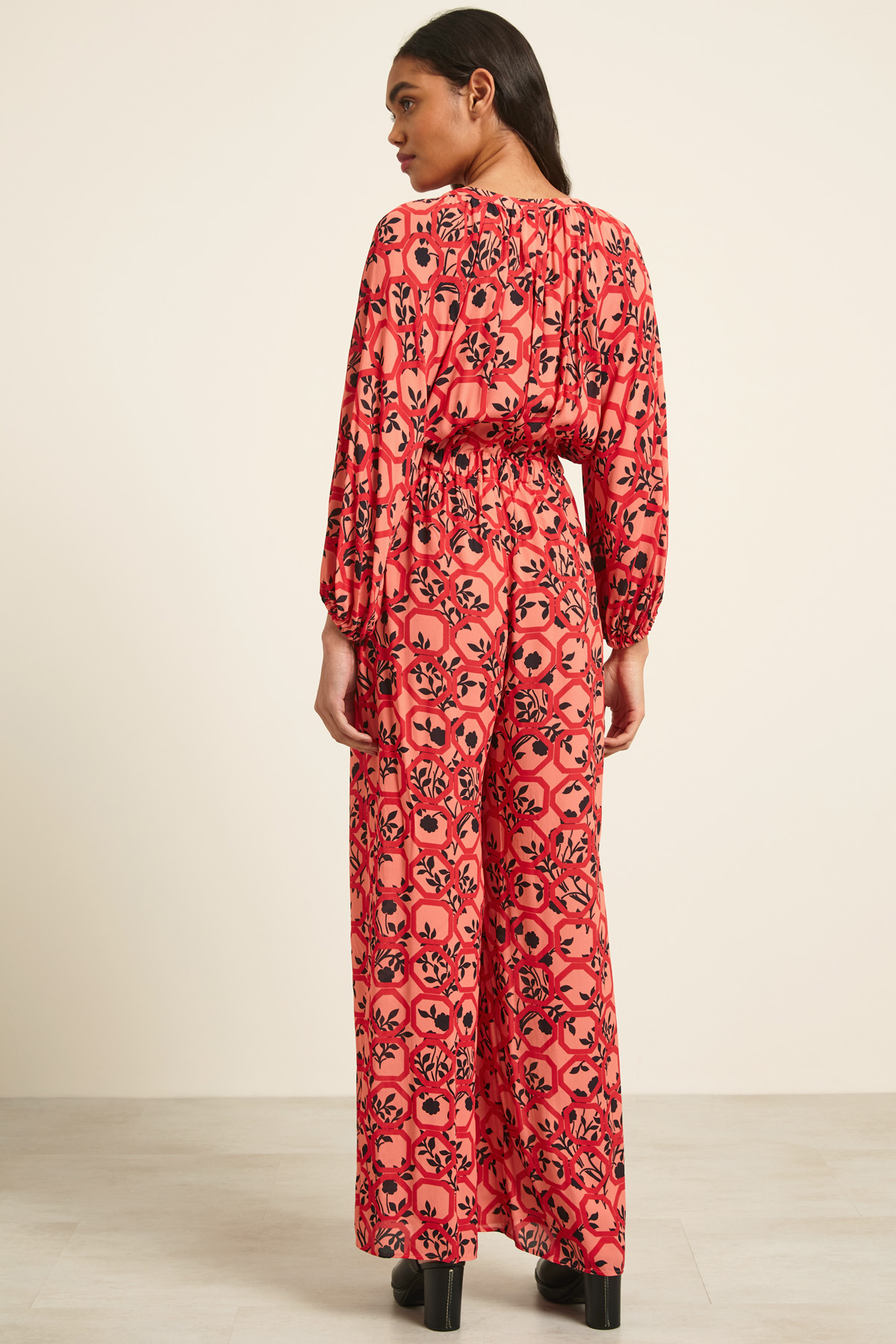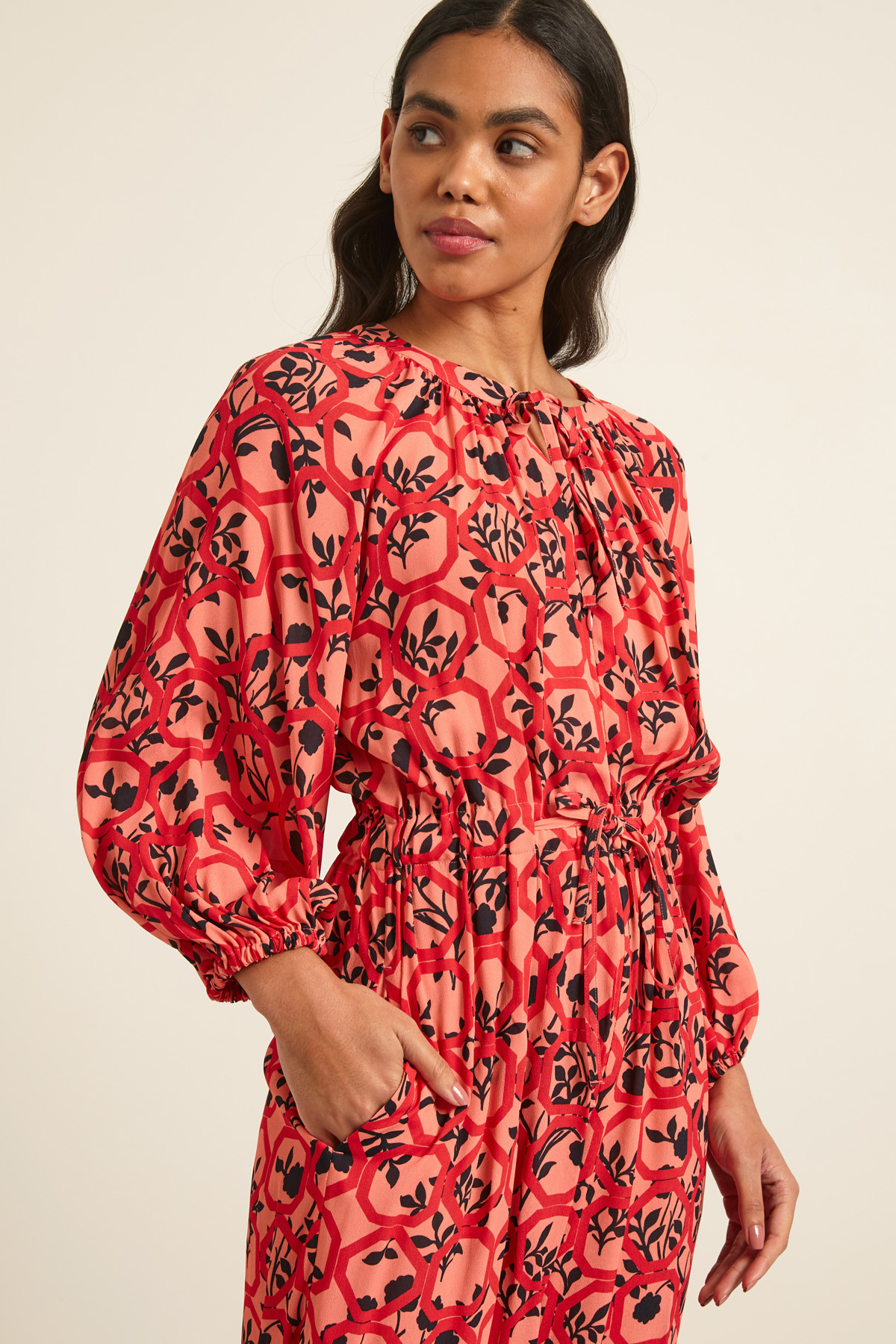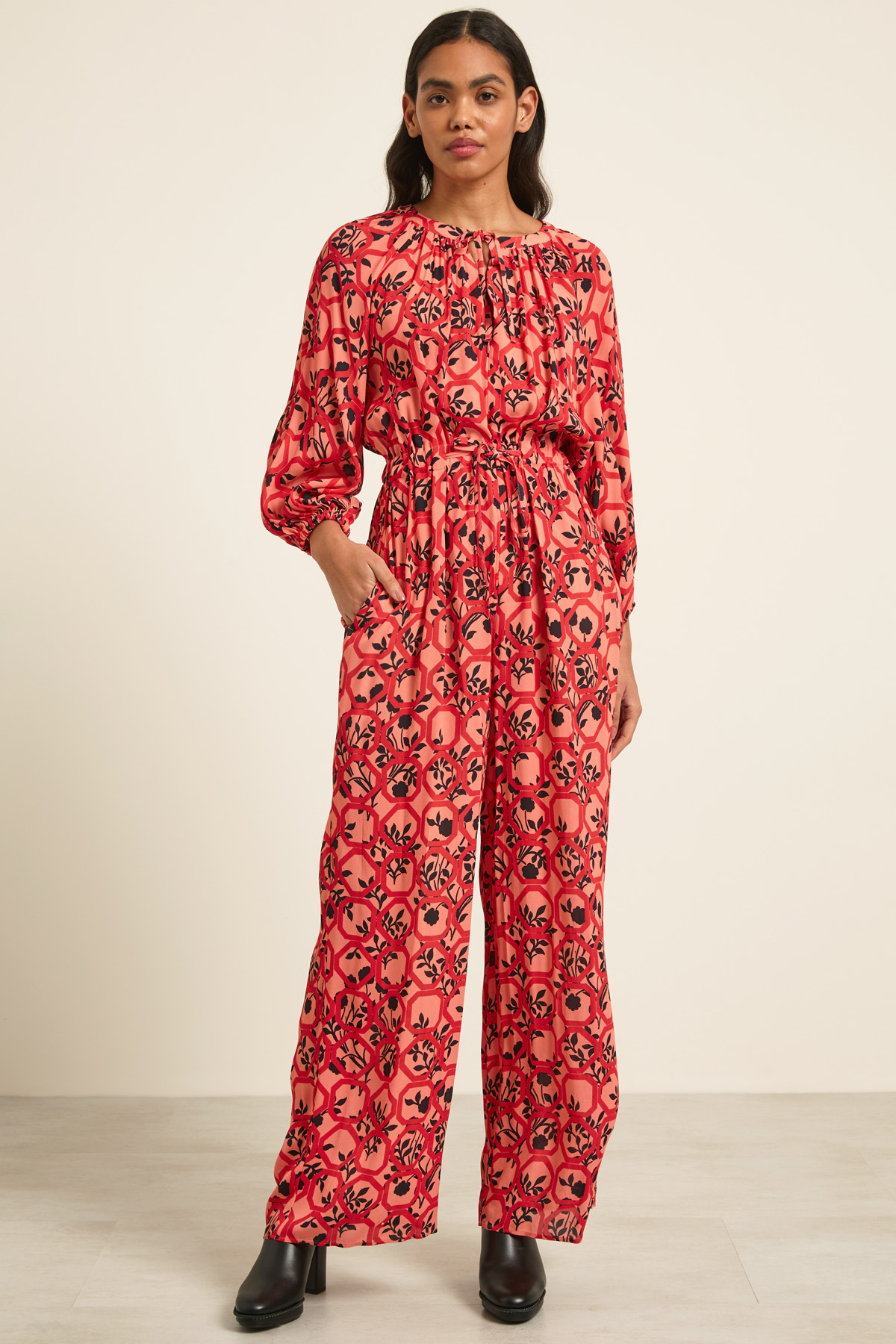 Tuta dalla linea fluida realizzata in sablè di pura viscosa stampata, scollo rotondo con laccetti e apertura a goccia, maniche tre quarti raglan, inserto elastico a fondo manica e al punto vita, coulisse al centro e tasche laterali inserite in cucitura. Allacciatura tramite zip invisibile sul davanti.
