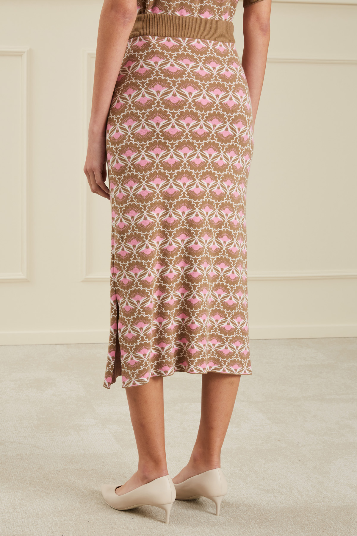 Gonna dalla linea a tubino realizzata in maglia di viscosa stretch, con lavorazione jacquard, inserto elastico in vita e spacco asimmetrico al fondo.