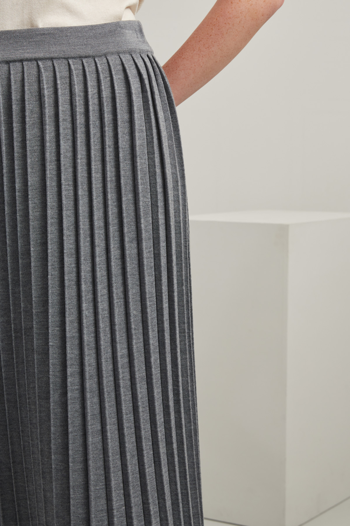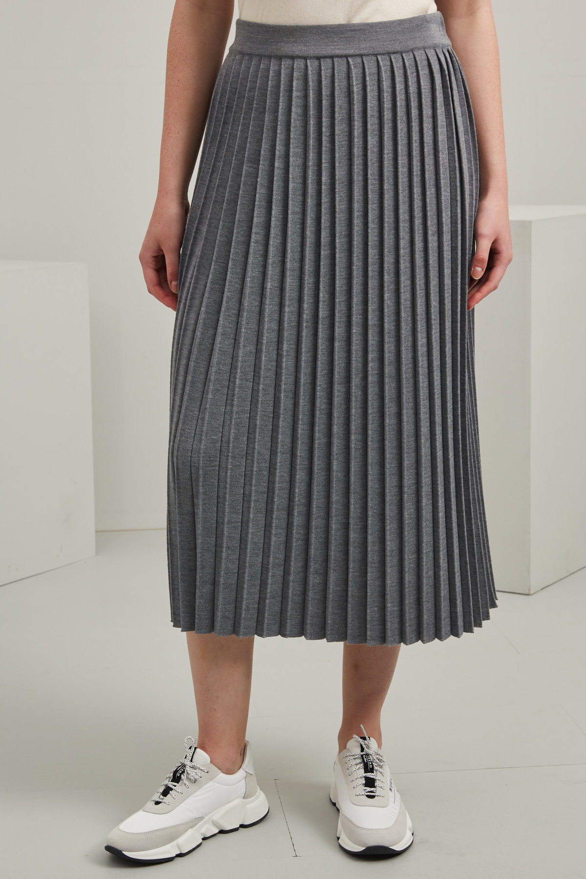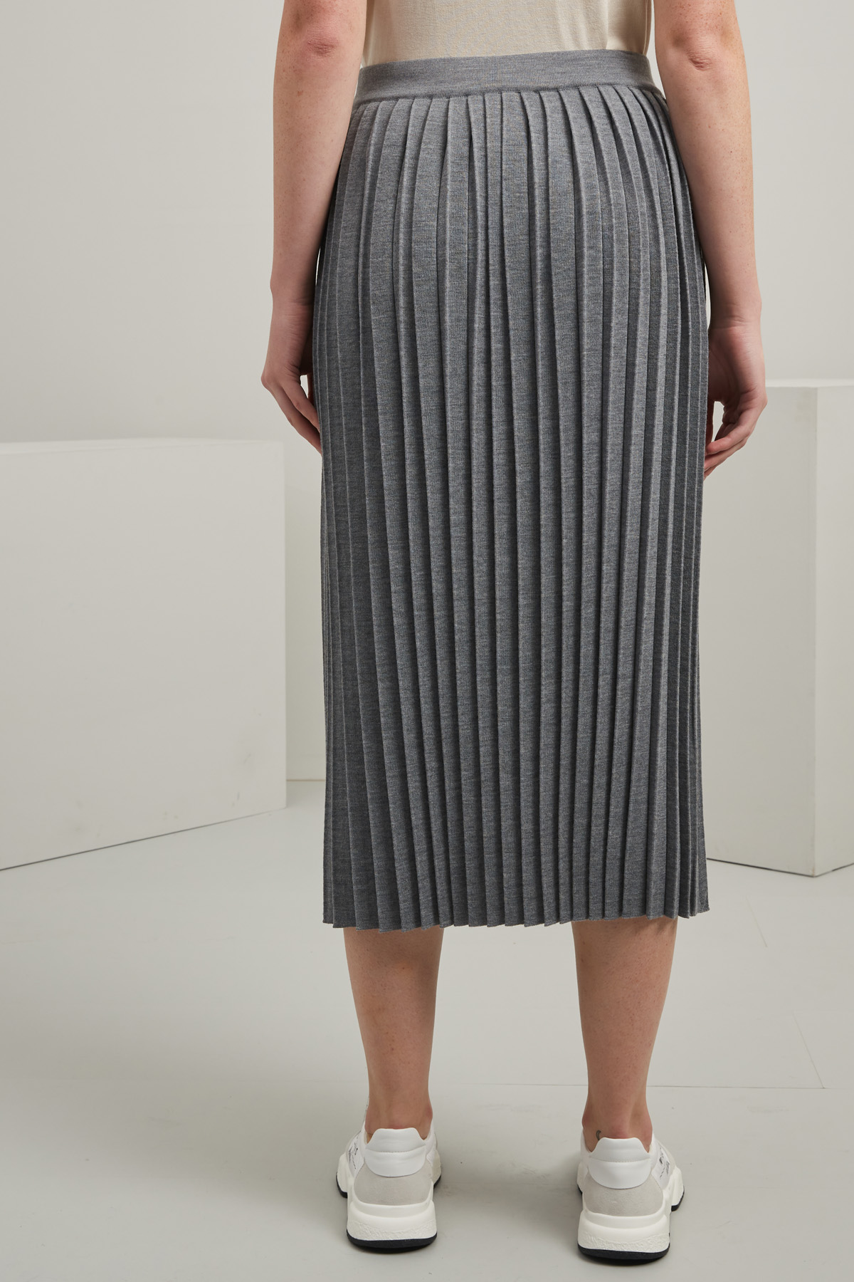 Gonna dalla linea dritta realizzata in maglia di misto lana tinto filo, con lavorazione plissè e inserto elastico in vita.
