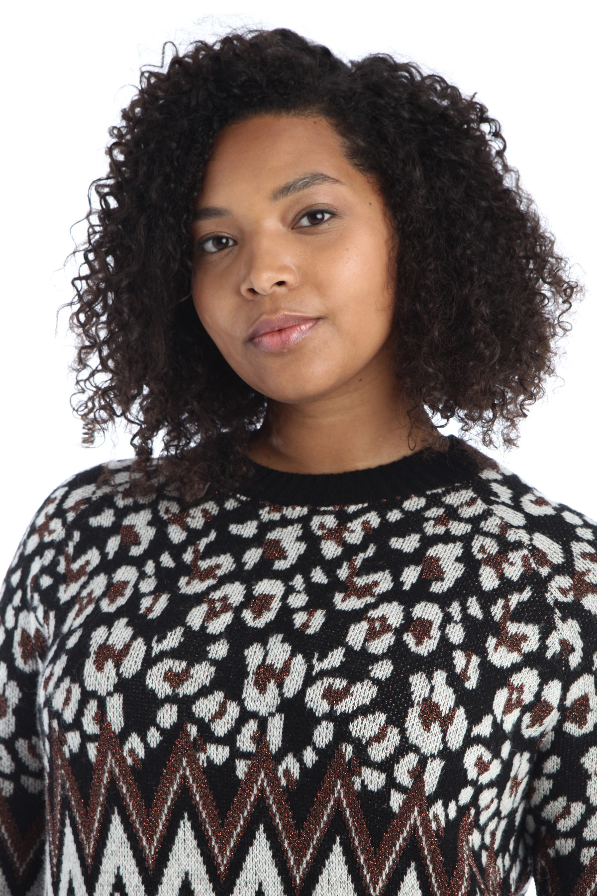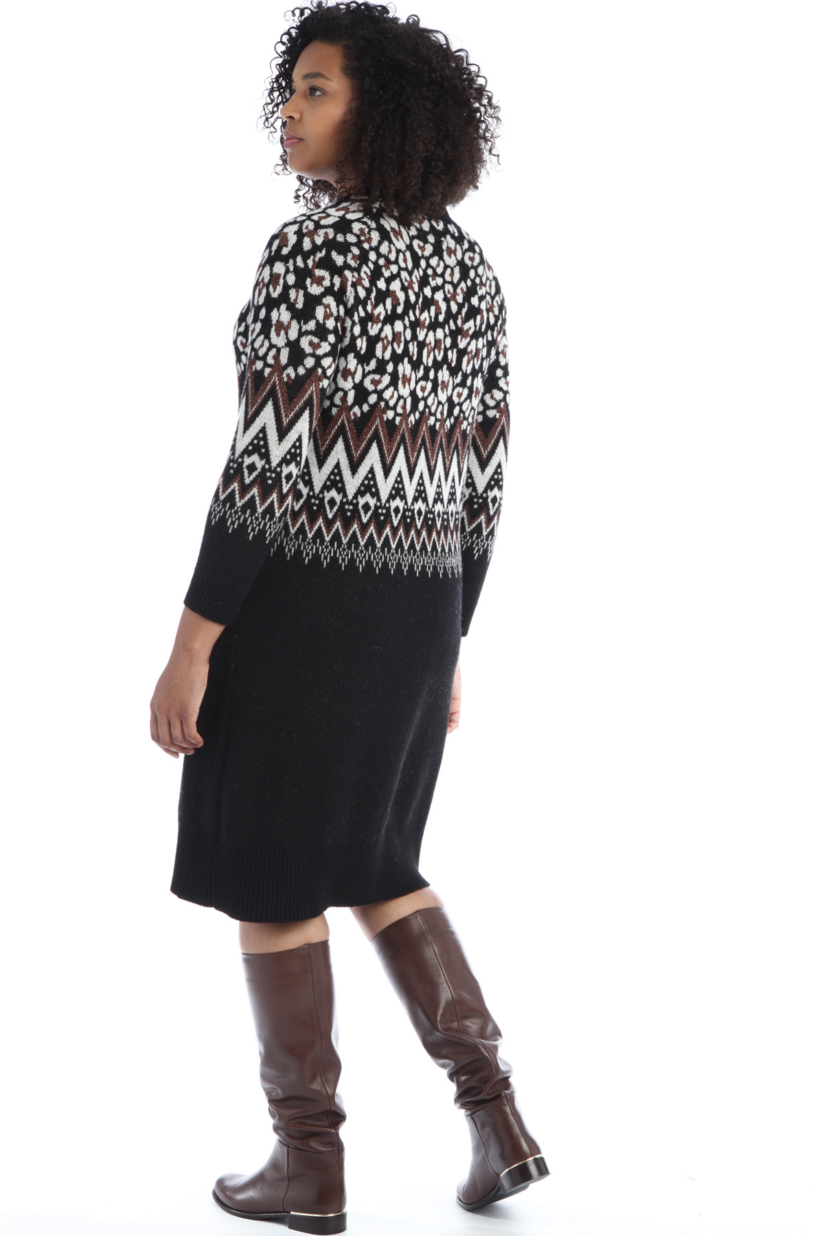 Abito dalla linea dritta realizzato in maglia di misto lana, con lavorazione jacquard sulla parte alta, inserto di fibra lamè, scollo a giro, maniche lunghe raglan e profili rifiniti a coste.