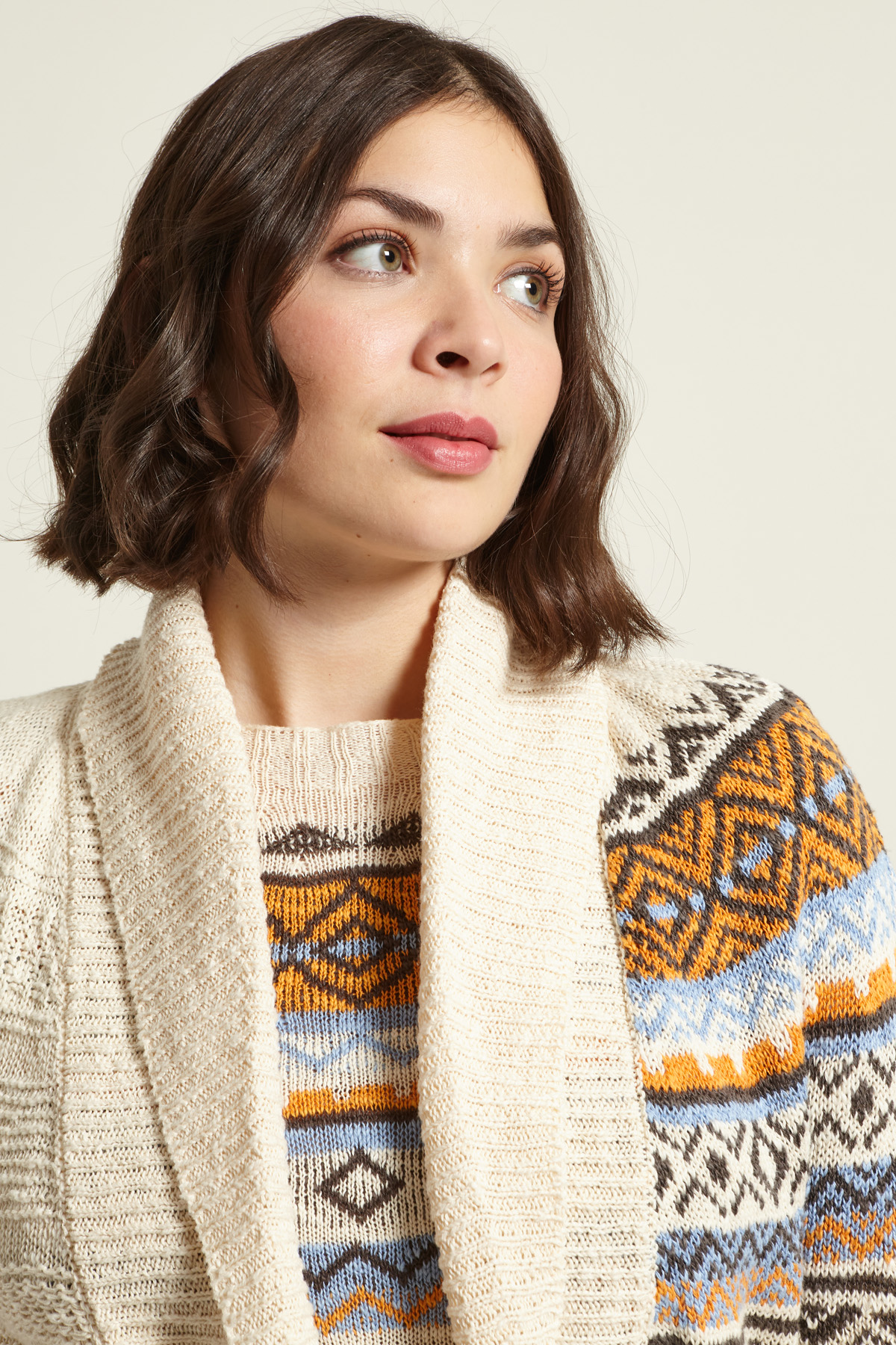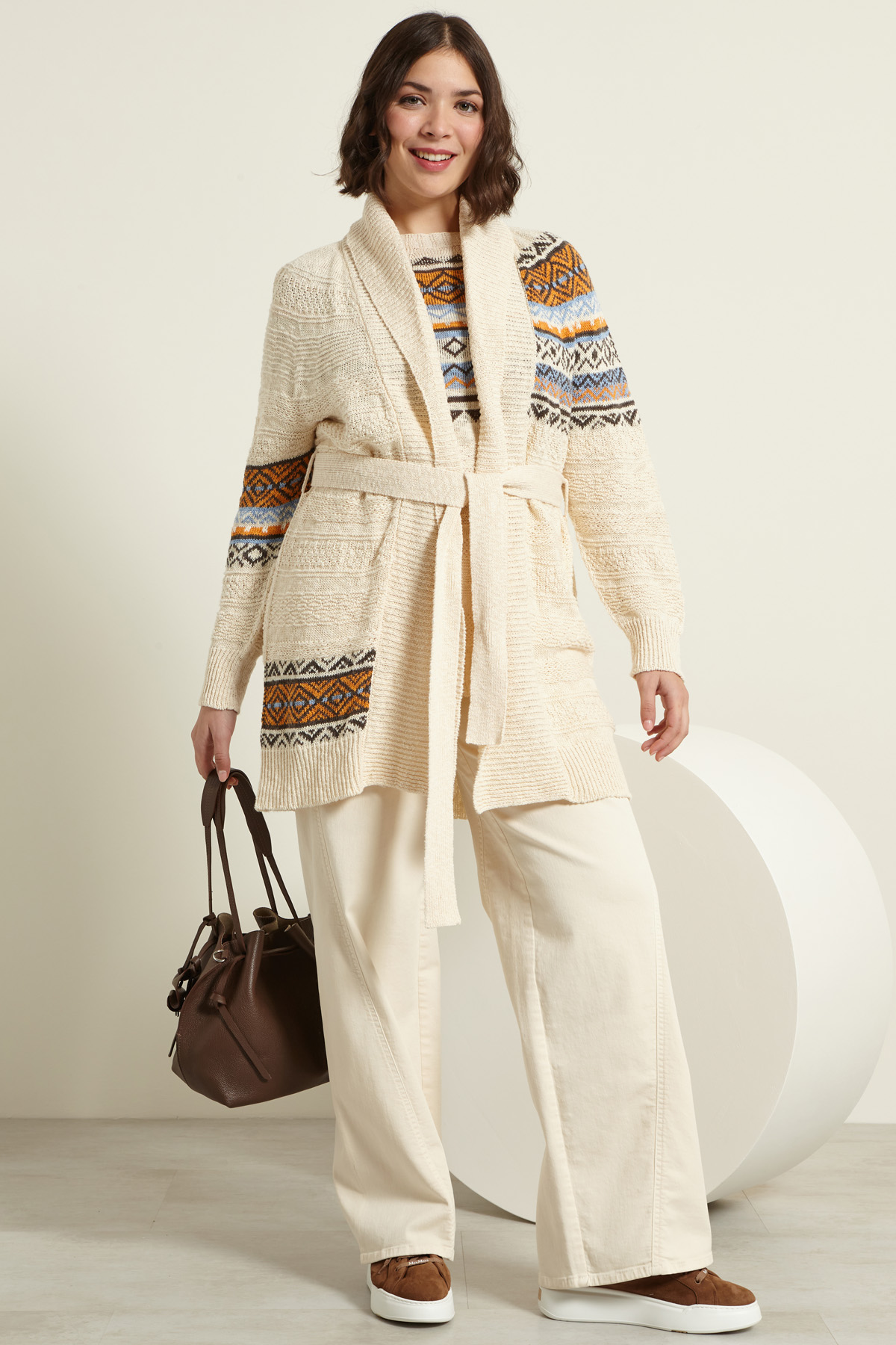 Cardigan lungo dalla linea dritta realizzato in filato di cotone e lino jacquard, con collo sciallato, maniche lunghe a kimono e profili rifiniti a coste. Allacciatura tramite cintura coordinata.