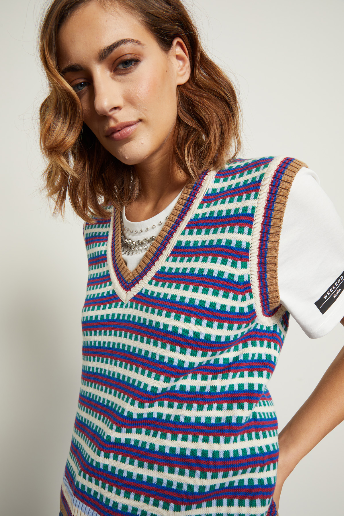 Gilet dalla linea dritta realizzato in maglia di misto cotone jacquard, con scollo a V e profili rifiniti a coste.