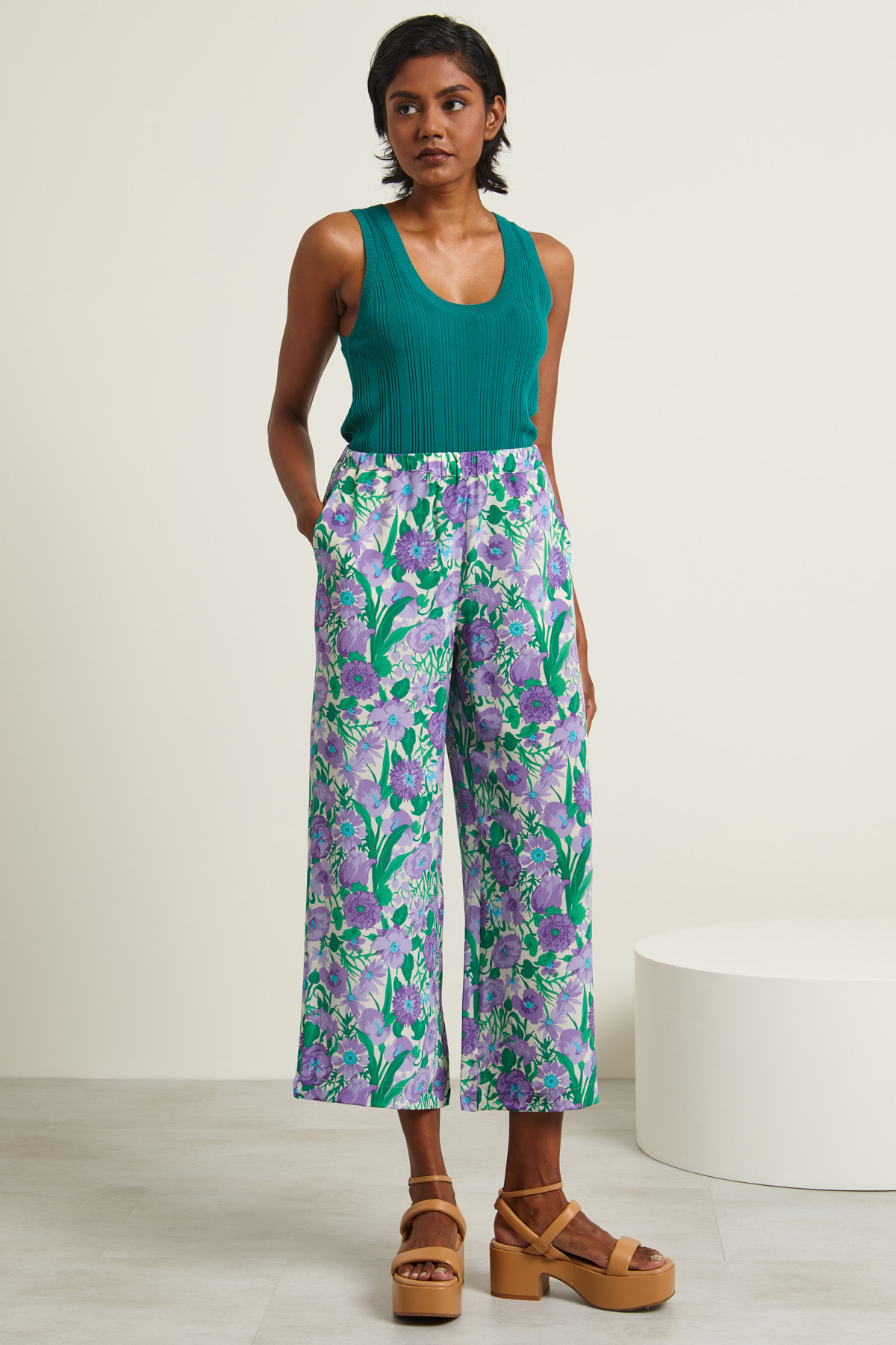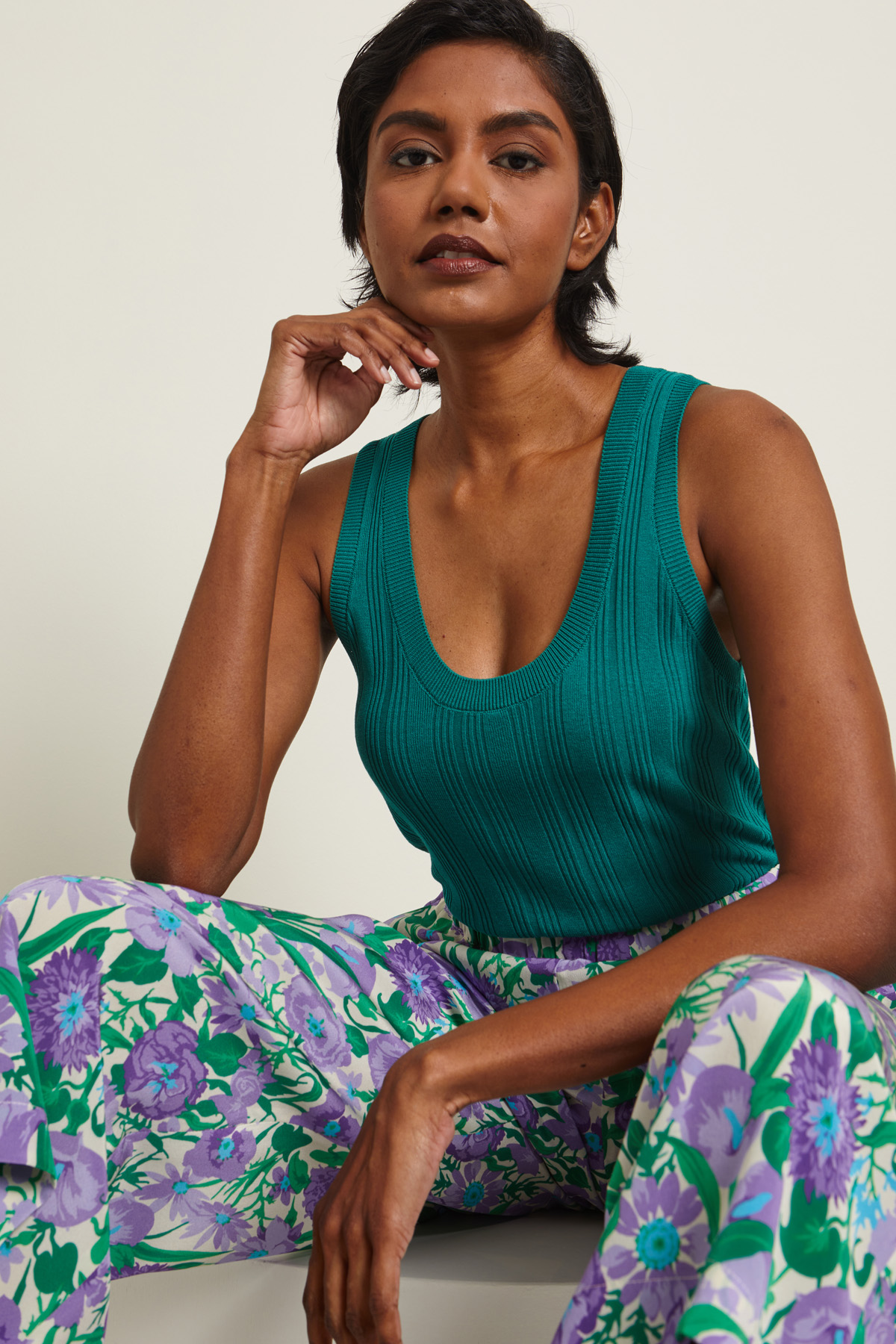 Canotta dalla linea aderente realizzata in filato di misto viscosa a coste con scollo a U e spalline spesse.