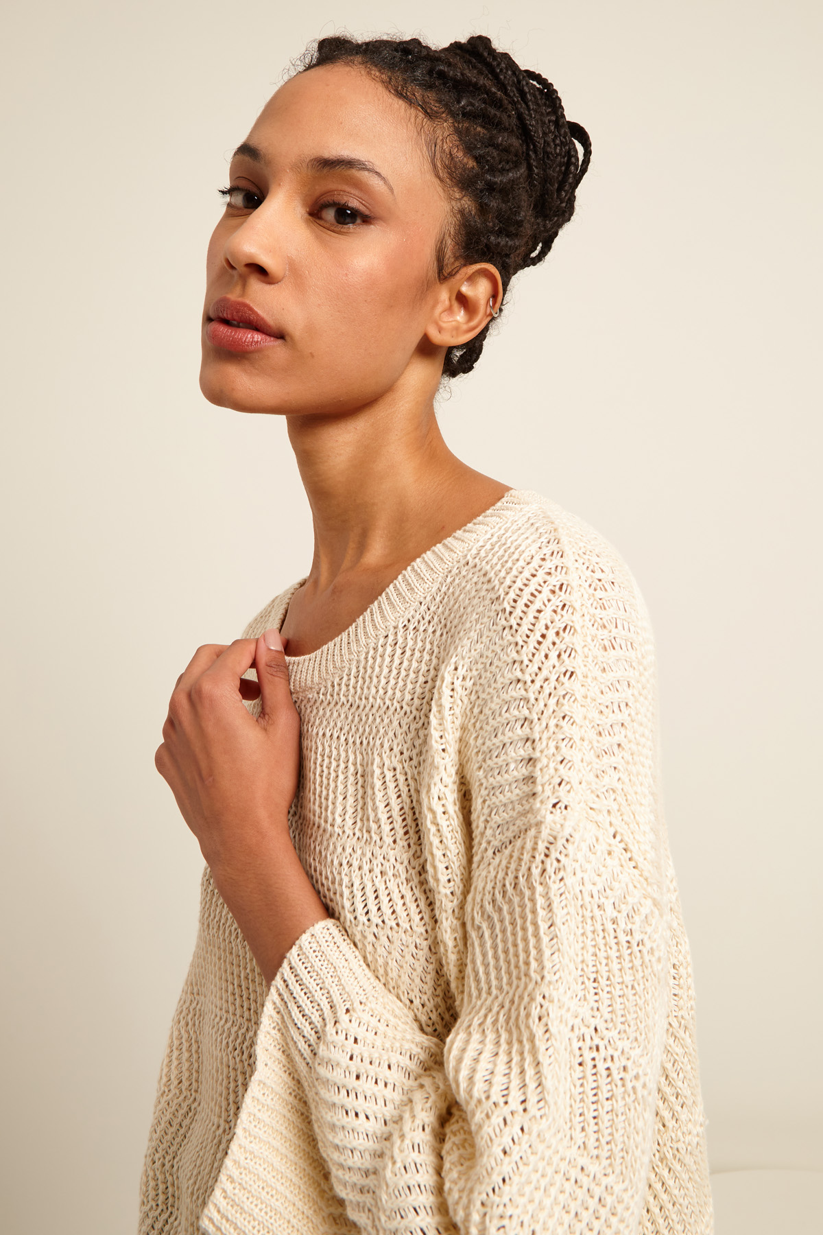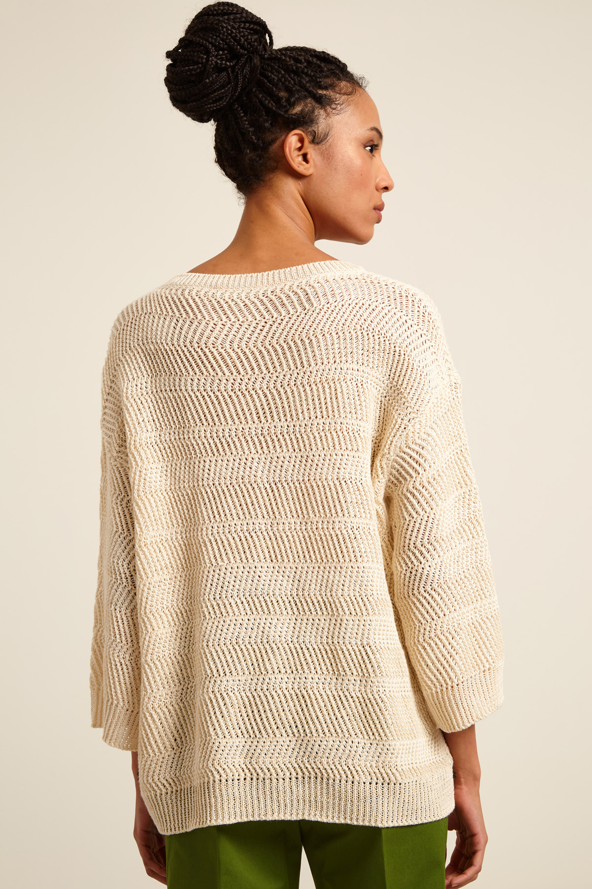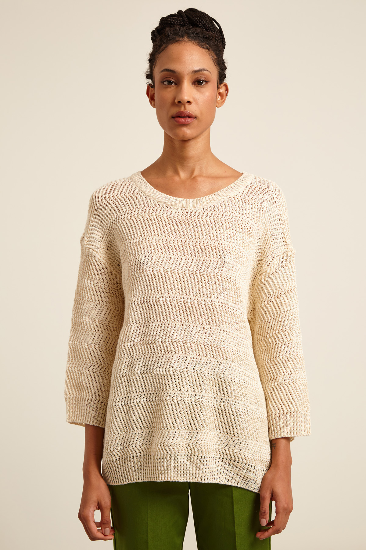 Maglia dalla linea over realizzata in filato di puro lino con lavorazione a intreccio, scollo a giro e maniche dal giro sceso.