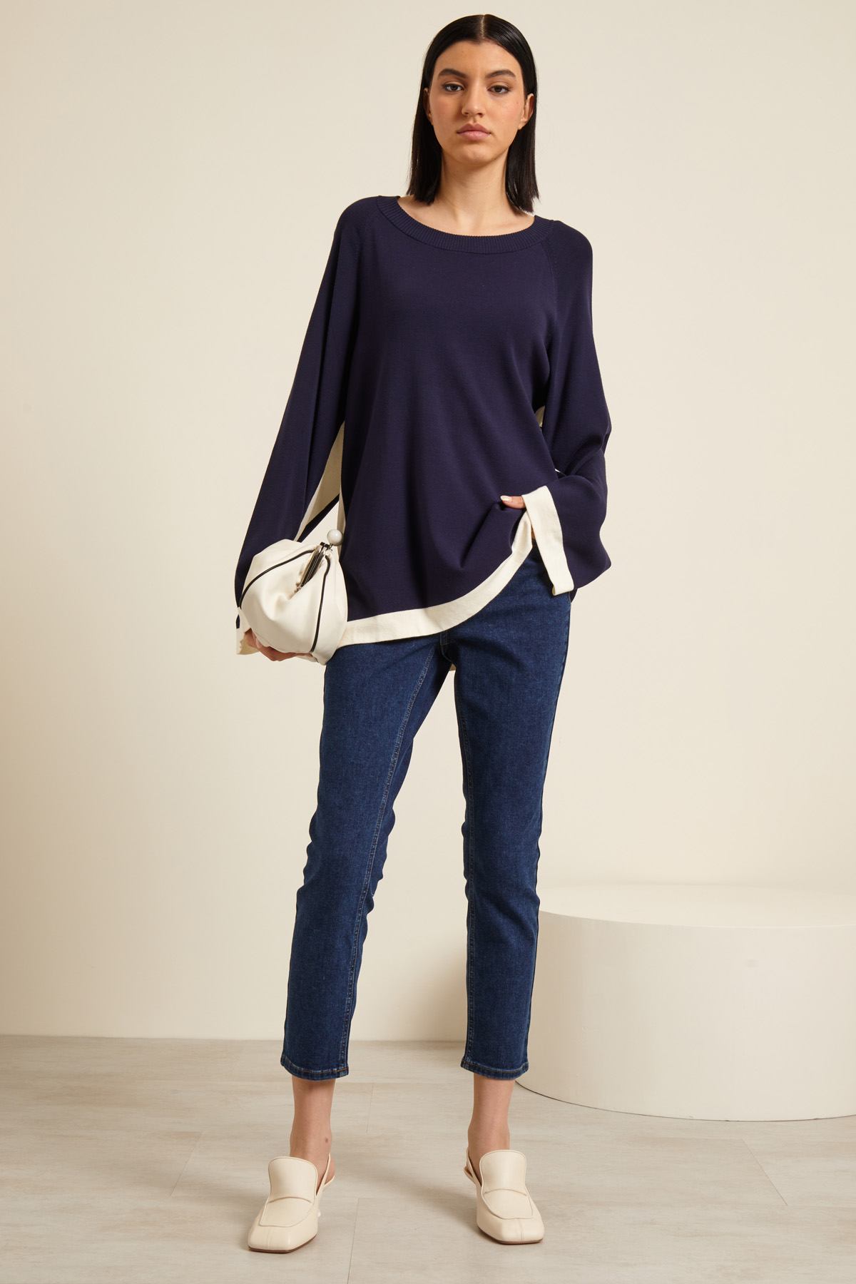 Maglia dalla linea morbida realizzato in filato di misto viscosa con profili a contrasto, scollo a giro e maniche lunghe raglan.