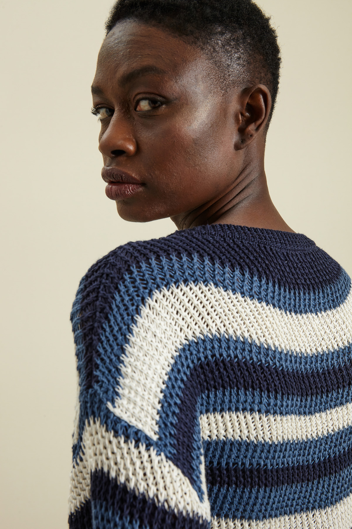 Maglia dalla linea over realizzata in filato di puro lino con lavorazione a uncinetto. Modello con scollo a barchetta e maniche ampie dal giro sceso.