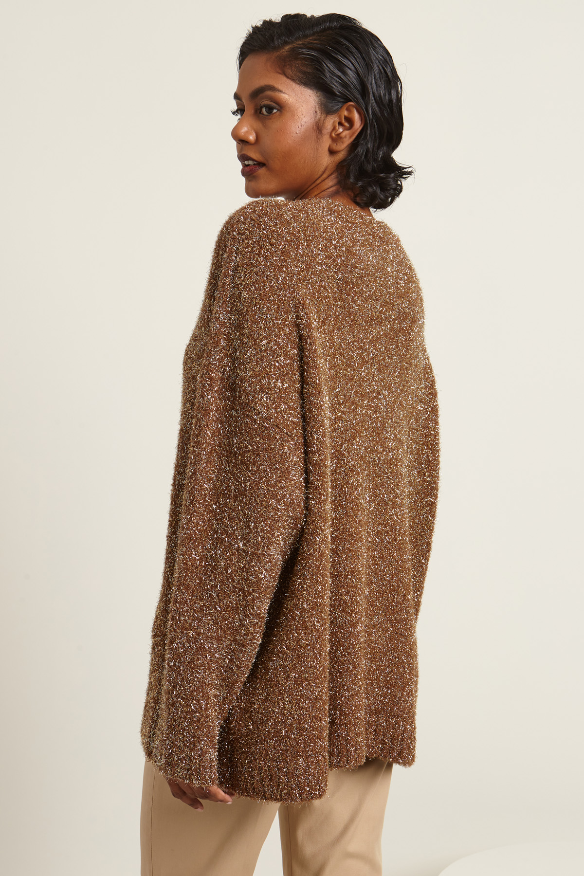 Maglia dalla linea dritta realizzata in filato di misto viscosa e lana con inserto in fibra lamè, collo a giro, maniche lunghe dal giro sceso e bordi rifiniti a coste.