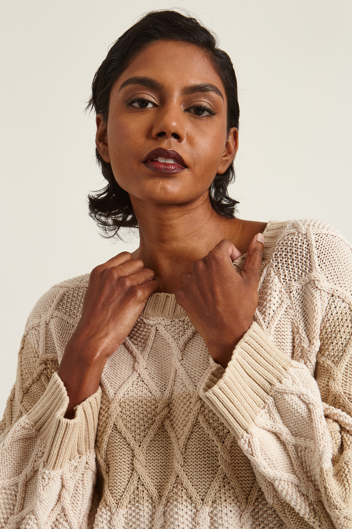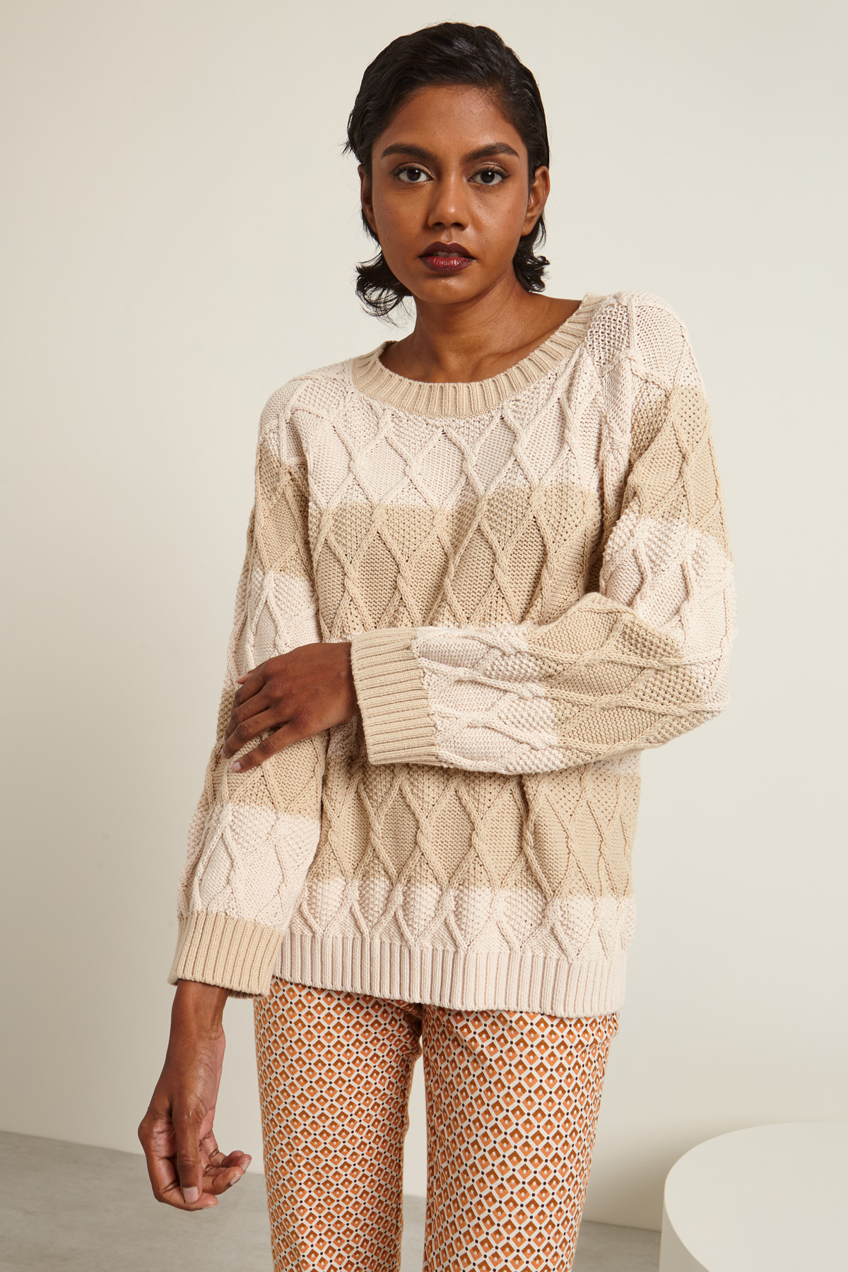 Maglia dalla linea dritta realizzata in filato di misto cotone con lavorazione a treccia, collo a giro, maniche lunghe raglan e profili rifiniti a coste.