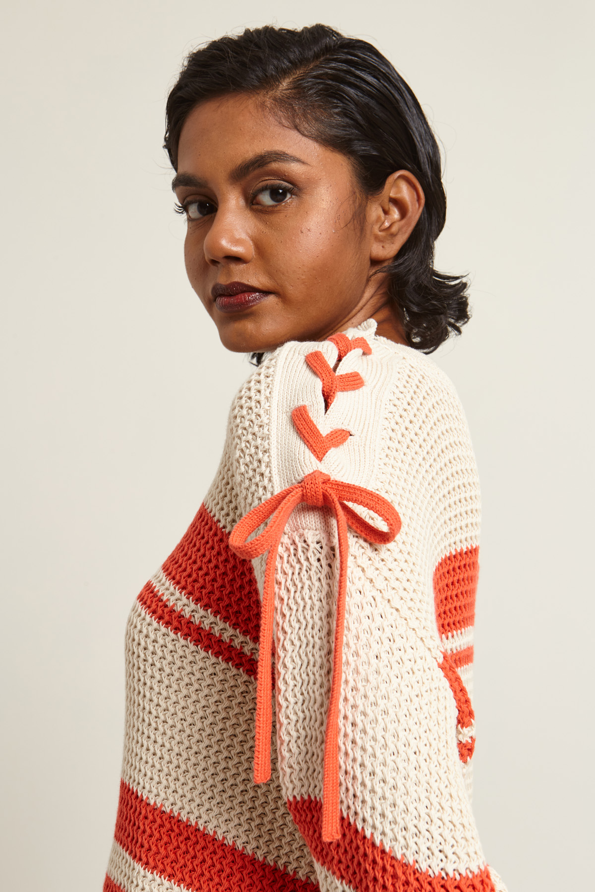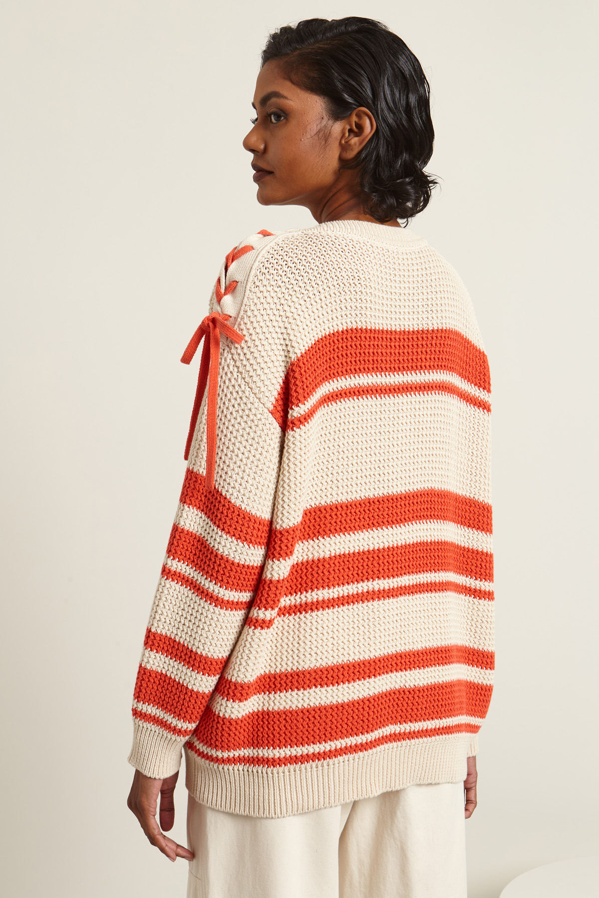Maglia dalla linea dritta realizzata in filato di misto cotone a righe, con collo a giro e bottone automatico, dettaglio di laccio intrecciato sulla spalla e maniche lunghe dal giro sceso.