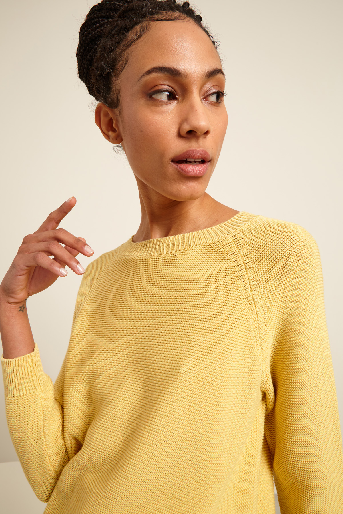 Maglia dalla linea dritta realizzata in filato di puro cotone, con scollo a giro, maniche lunghe raglan e profili rifiniti a coste.