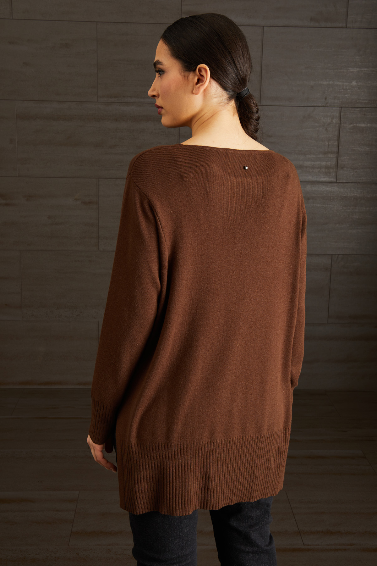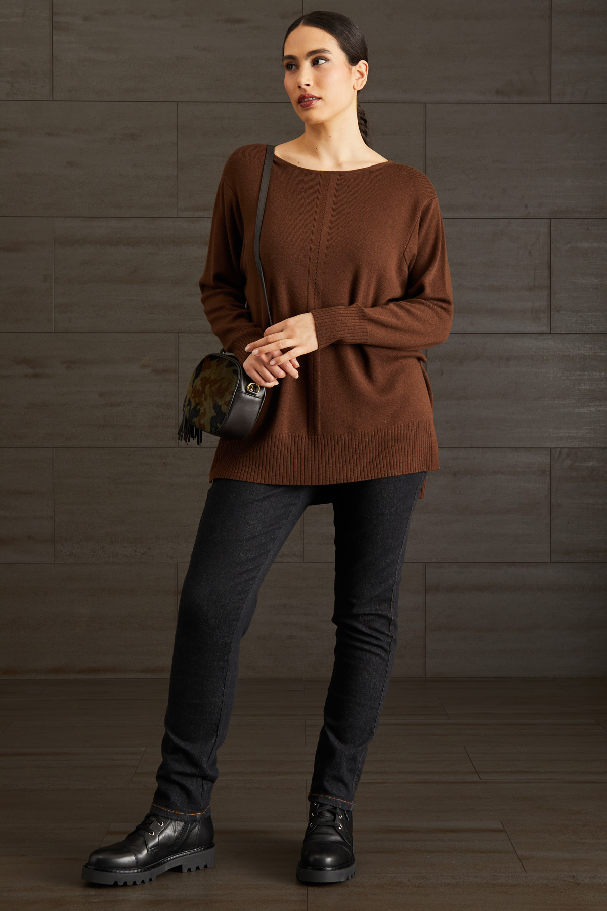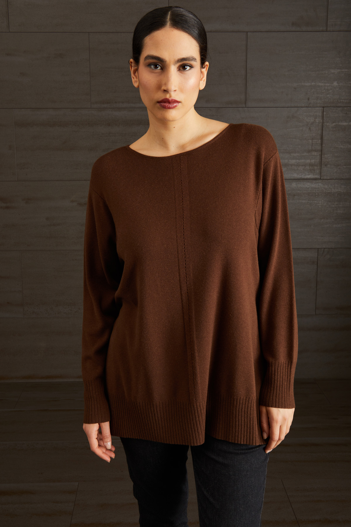 Maglia dalla linea dritta realizzata in filato di misto viscosa e cashmere, con scollo rotondo, maniche lunghe con giro inserito e spacchi laterali.