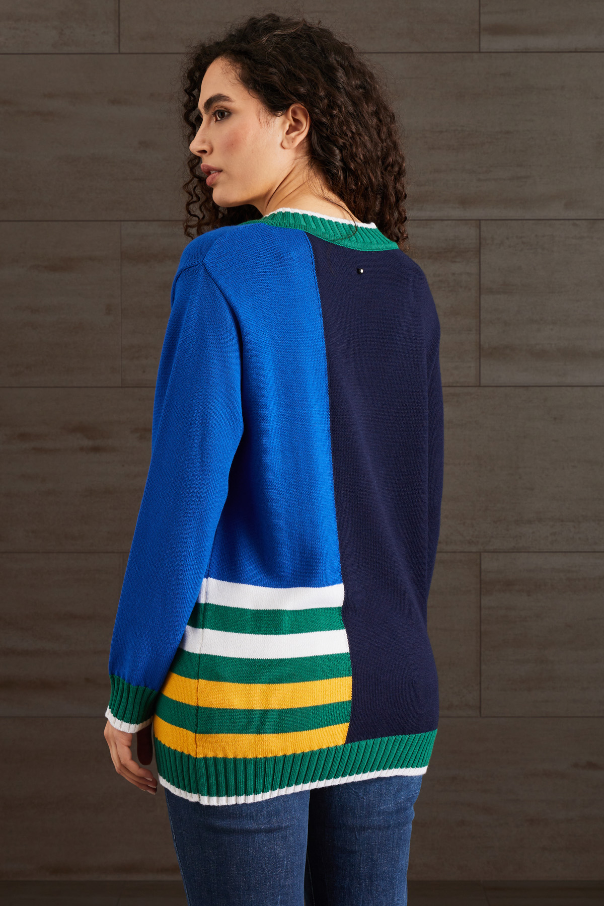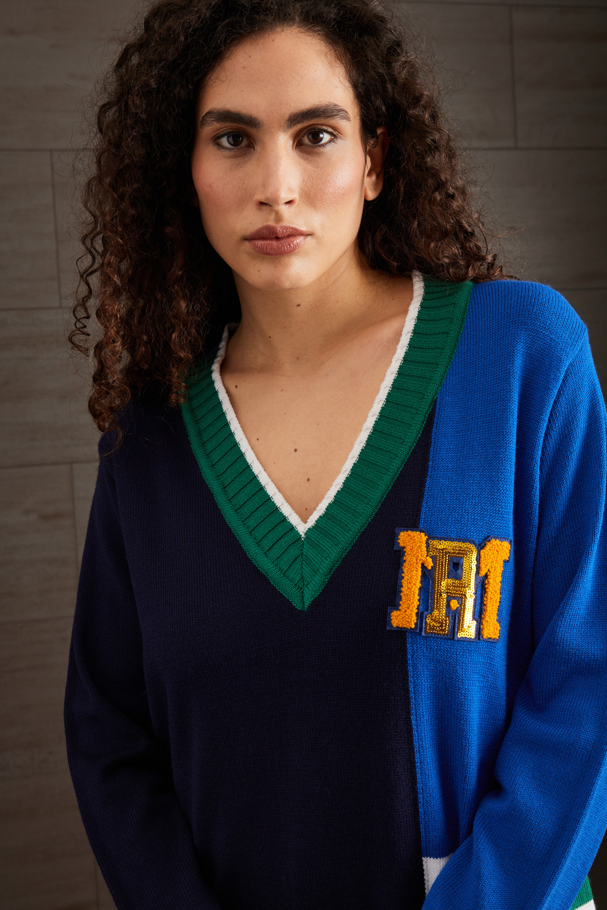 Maglia dalla linea dritta realizzata in filato di misto lana, con lavorazione a intarsio, scollatura a V, maniche lunghe, profili rifiniti a costine.