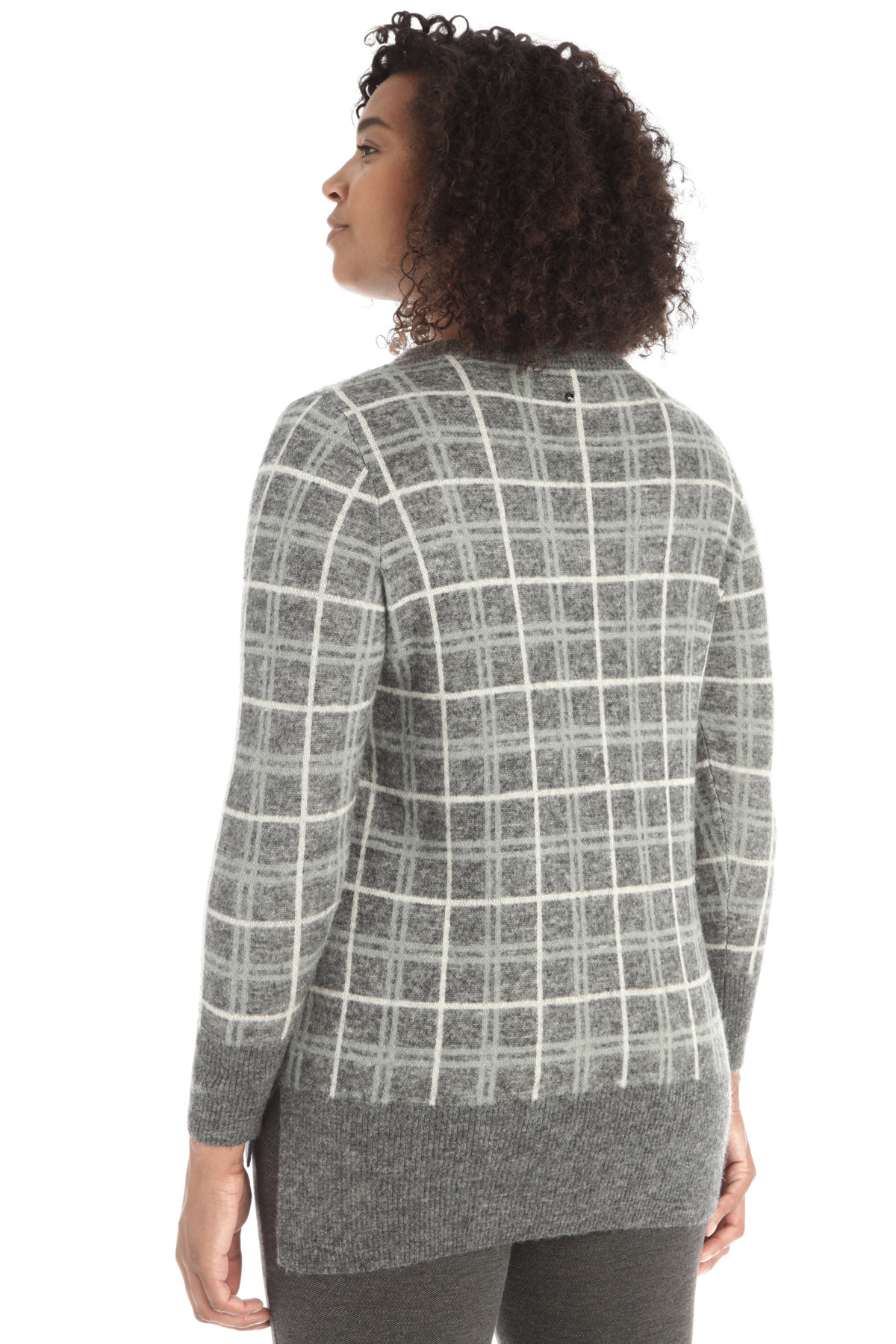 Maglia dalla linea dritta realizzata in filato di misto lana jacquard, con scollo a giro, maniche lunghe, spacchetti sui lati e orlo più lungo sul retro. Bordi rifiniti a coste.
