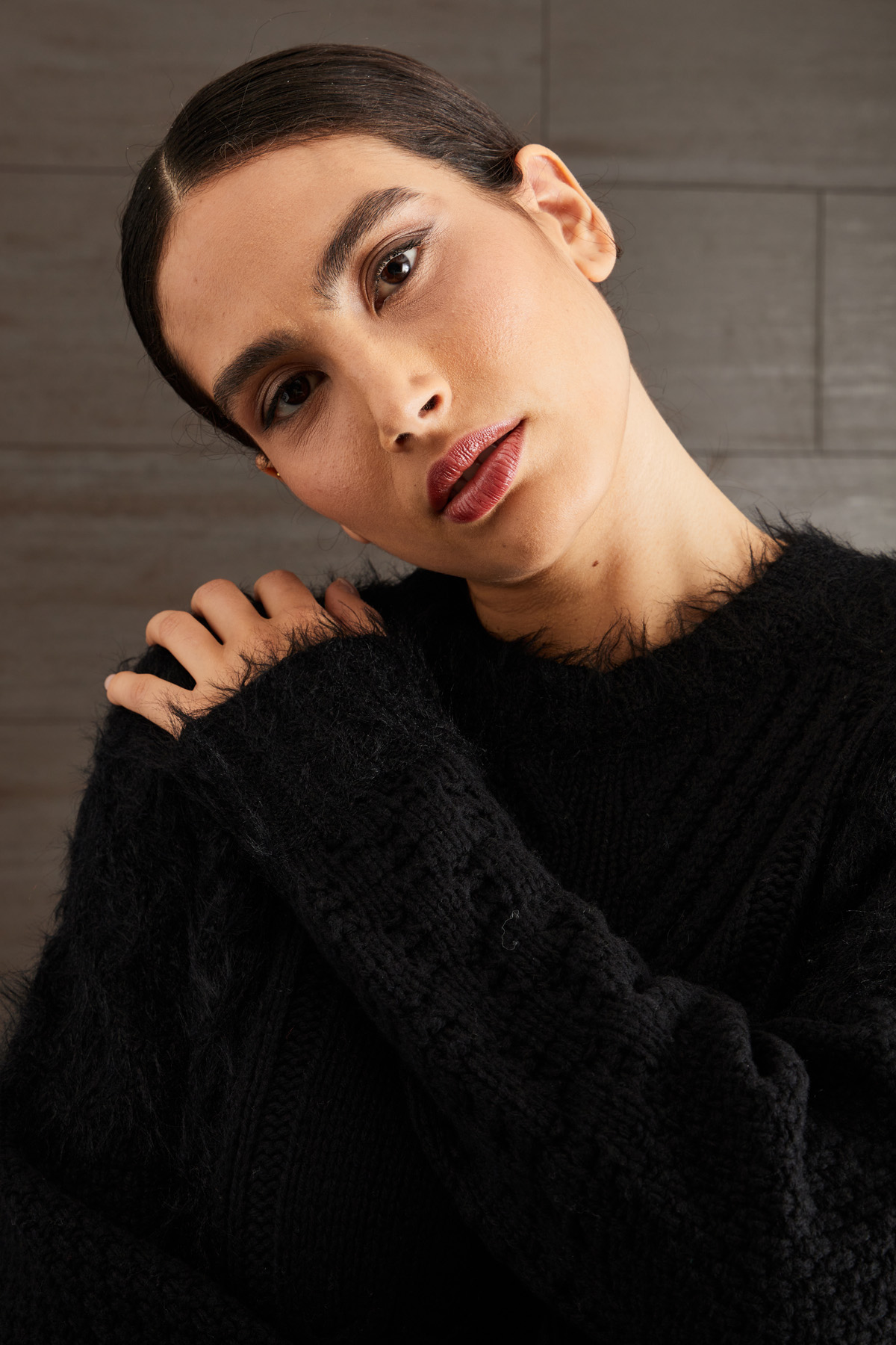 Maglia dalla linea dritta realizzata in filato garzato di misto lana, con lavorazione a rilievo, scollo a giro, maniche lunghe raglan e profili rifiniti a coste.