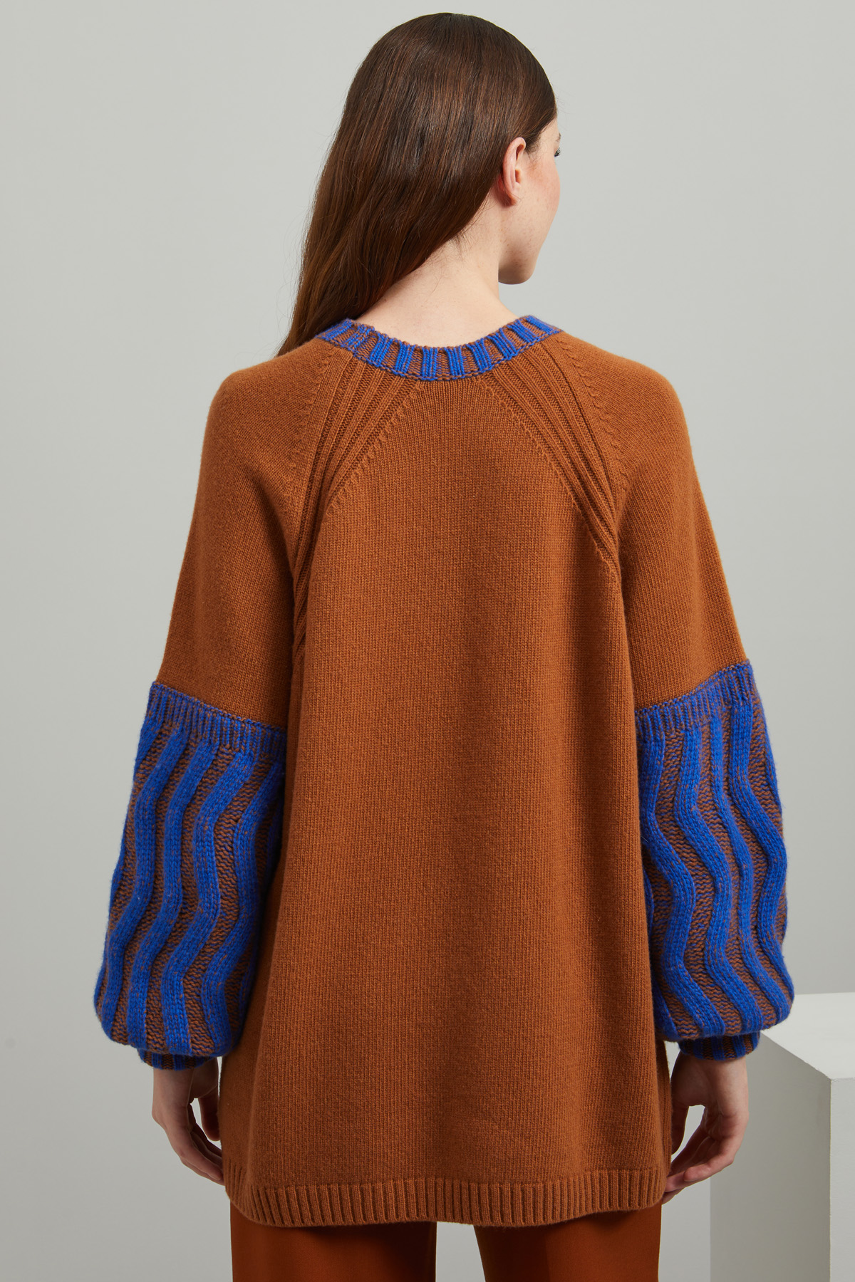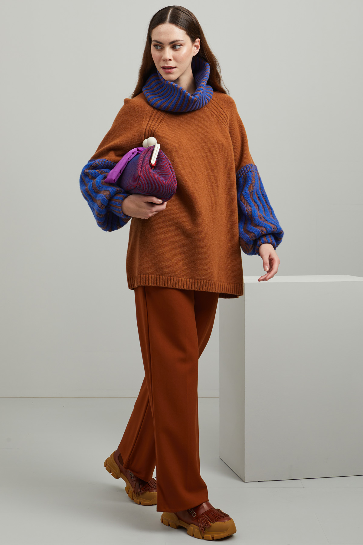 Maglia dalla linea morbida realizzata in filato di pura lana tinto filo, collo alto risvoltato removibile, maniche lunghe raglan a palloncino con polsino stretto e profili rifiniti a coste.