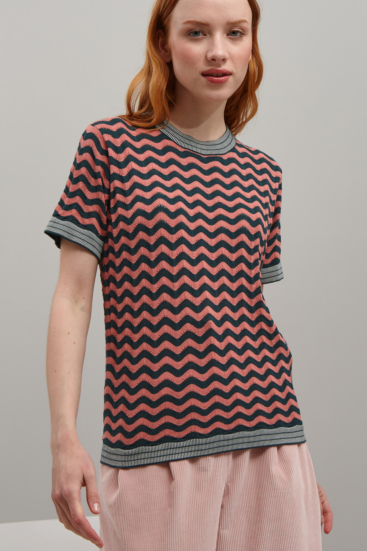 Maglia dalla linea dritta realizzata in maglia di viscosa stretch, con scollo a giro, maniche corte e bordi rifiniti a coste dal colore a contrasto.
