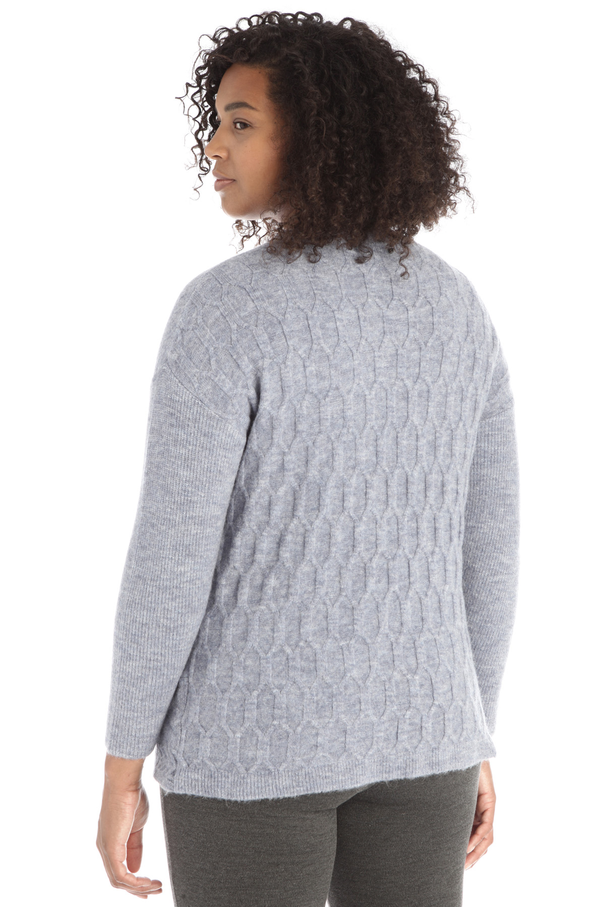 Maglia dalla linea dritta realizzata in filato di misto lana stretch con lavorazione a rilievo sul retro, scollo a giro e maniche lunghe a giro basso.