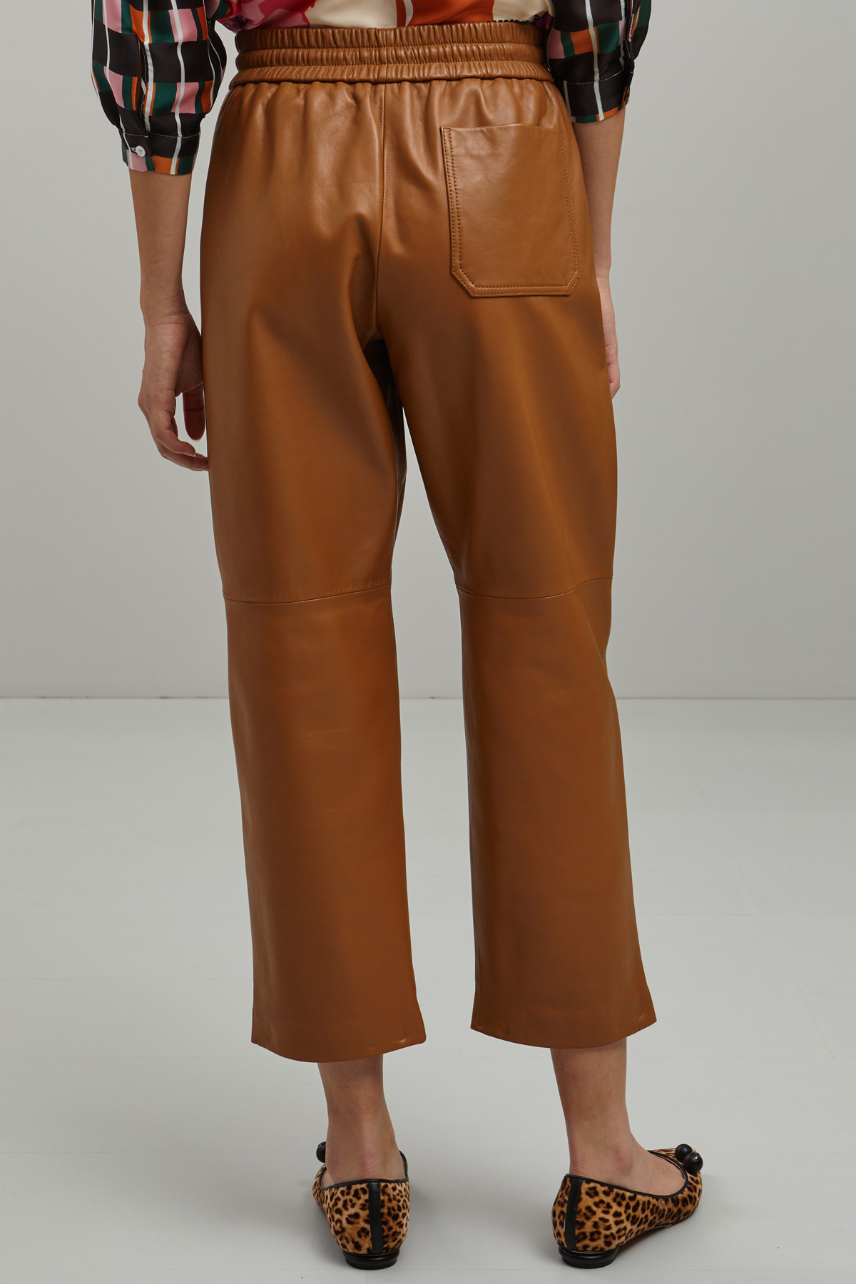 Pantaloni dalla linea dritta realizzati in vera pelle con inserto elastico in vita e coulisse, tasche inserite in cucitura davanti e applicata nel retro.