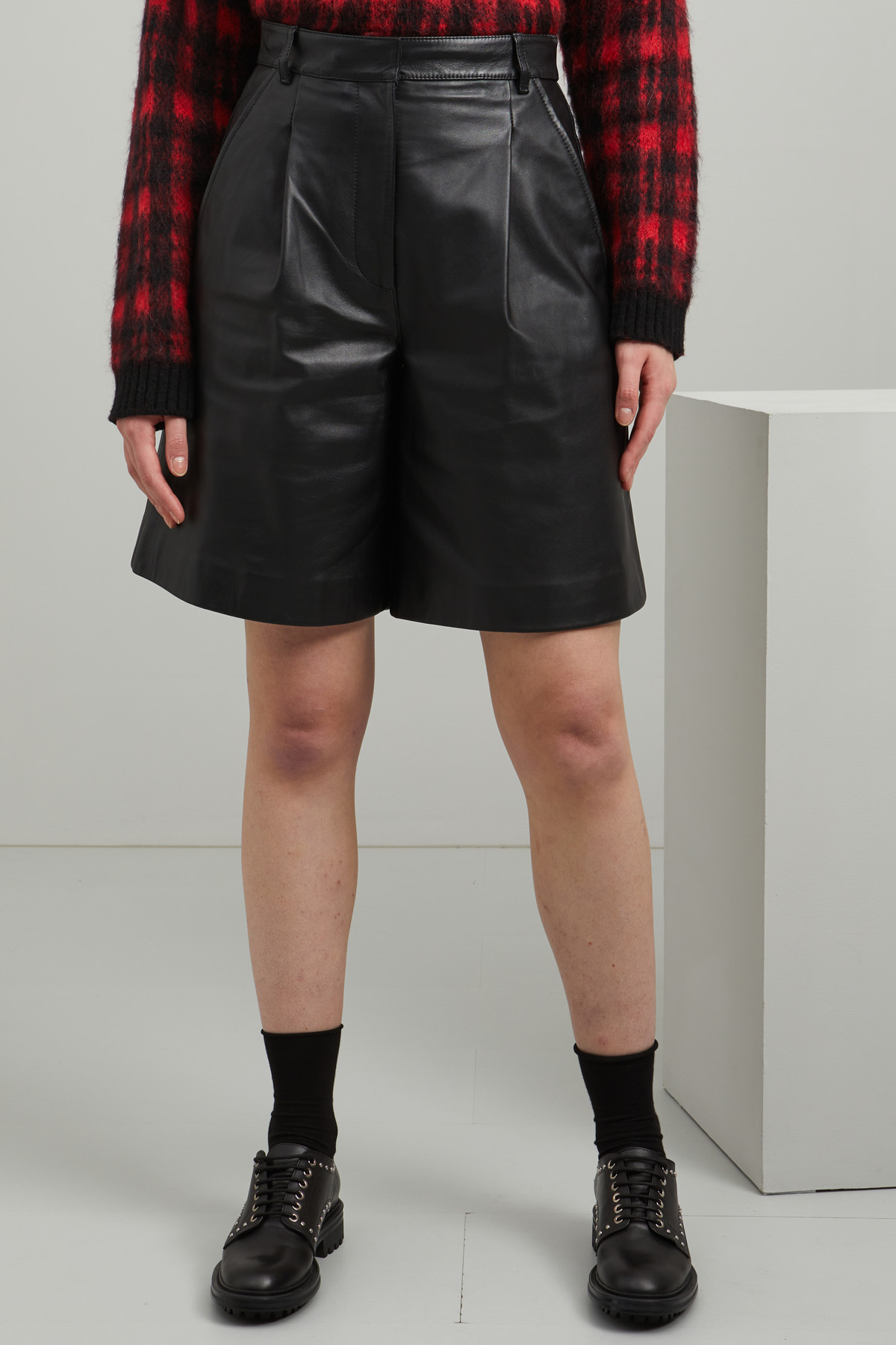 Bermuda dalla linea morbida realizzati in vera pelle con passanti in vita, pinces sul davanti, tasche alla francese sui lati e a filetto nel retro. Allacciatura nascosta tramite zip, bottone e ganci. Foderati.