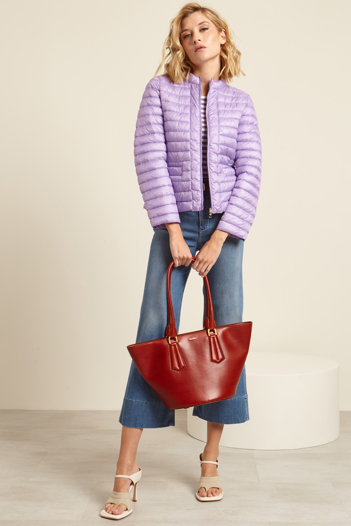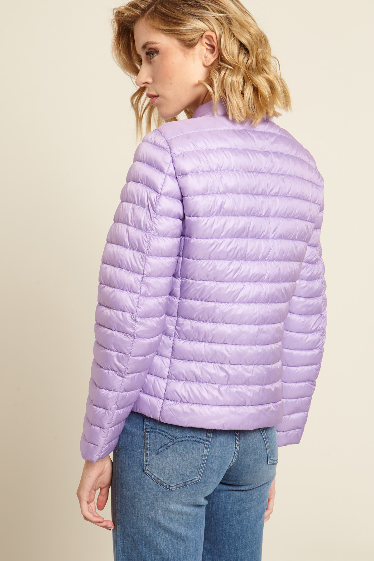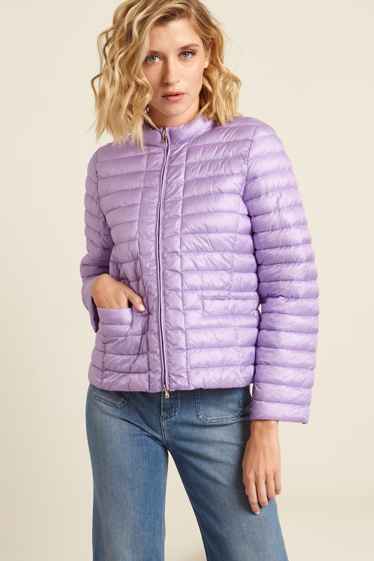 Imbottito sfiancato realizzato in raso antigoccia trapuntato, con collo a listino, maniche lunghe e tasche a filettone con bottone. Allacciatura tramite zip.