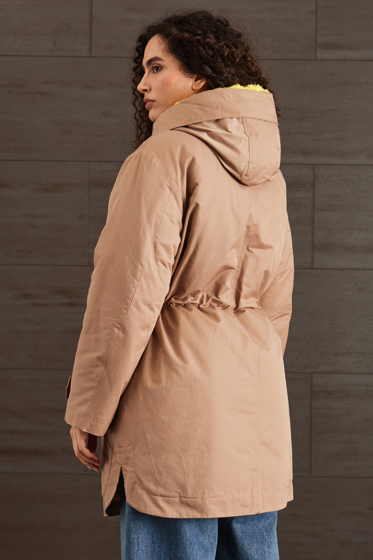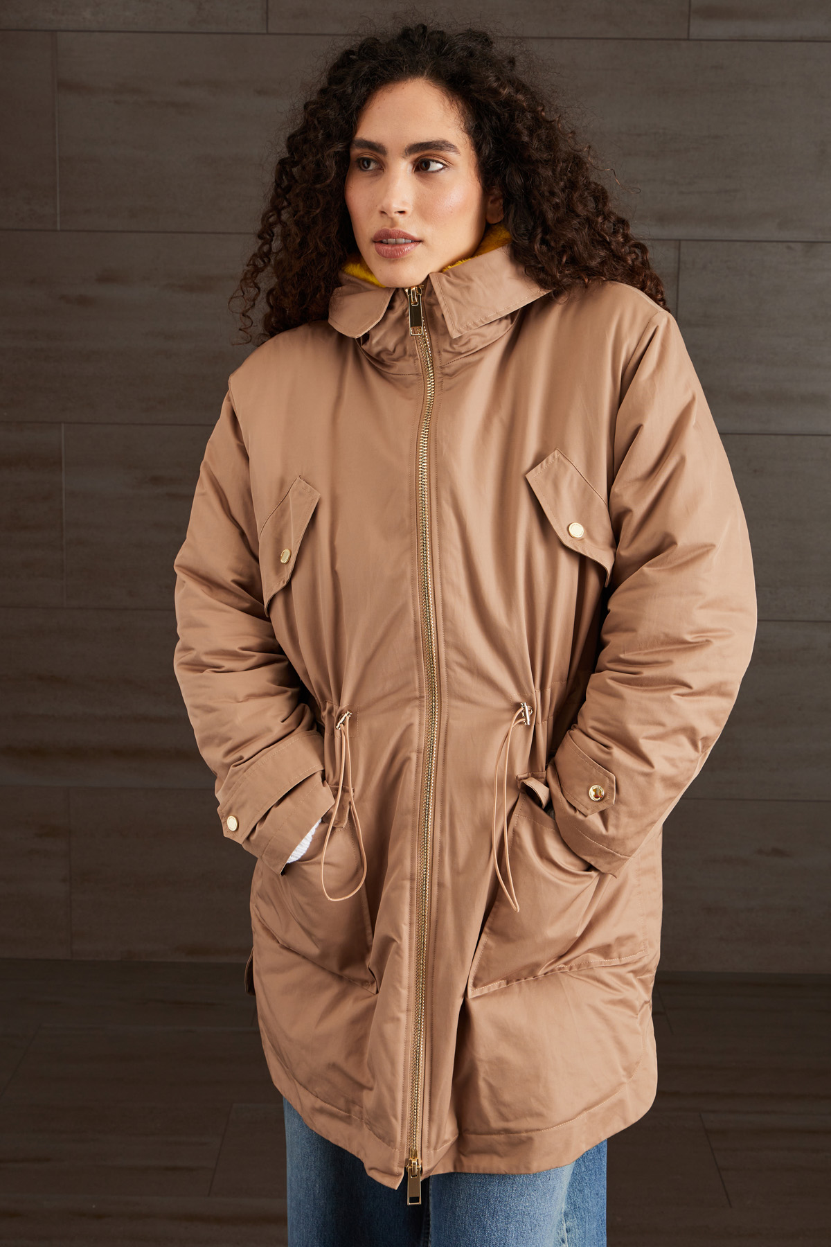 Parka imbottito dalla linea dritta realizzato in gabardina di misto cotone antigoccia, con cappuccio e collo risvoltato, maniche lunghe con cinturino al polso, coulisse in vita, taschini a filetto con patta sul petto, tasche applicate con patta e bottone, spacchetti laterali al fondo. Interno foderato in tessuto effetto pelliccia removibile. Allacciatura monopetto tramite zip.