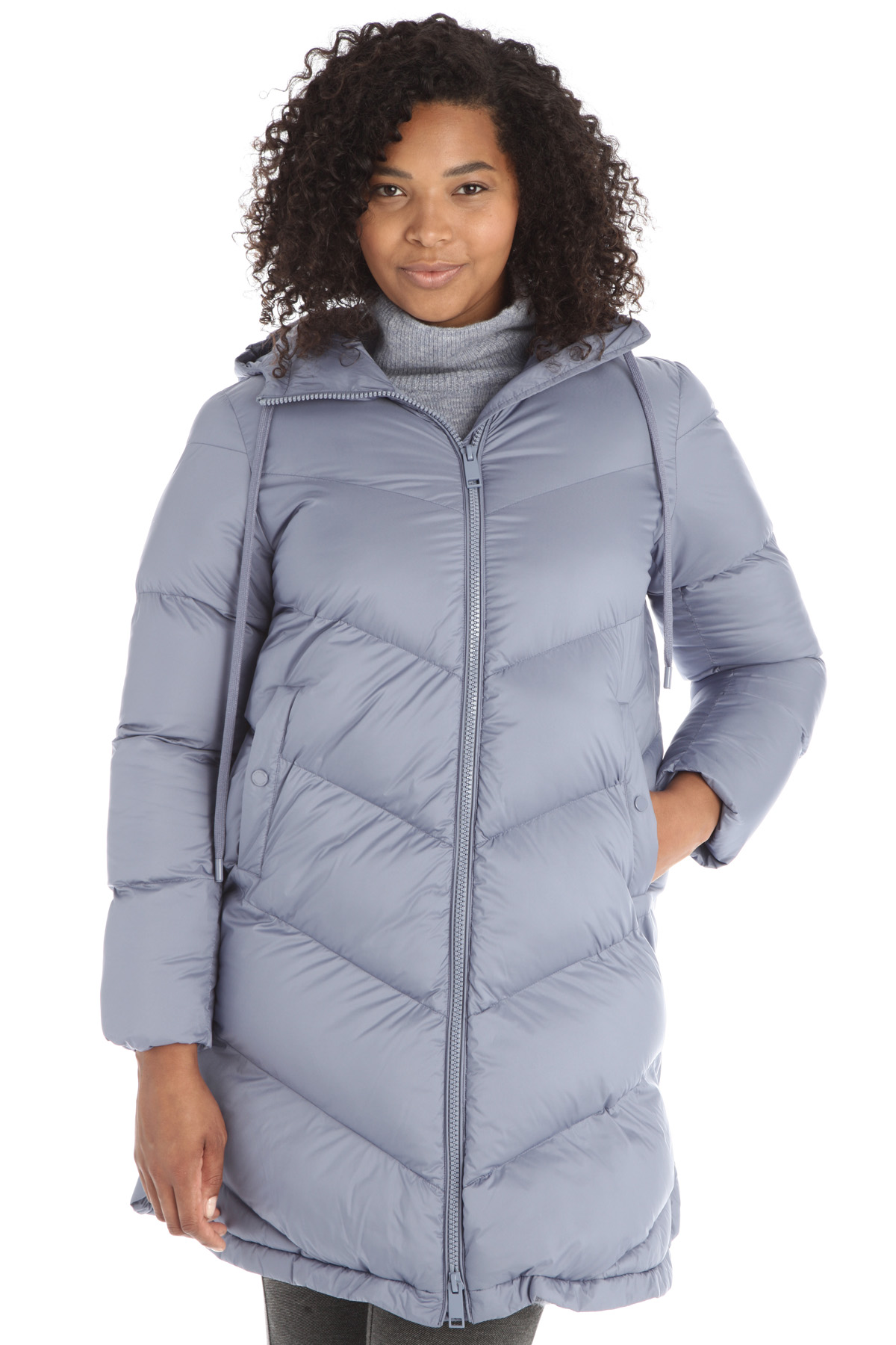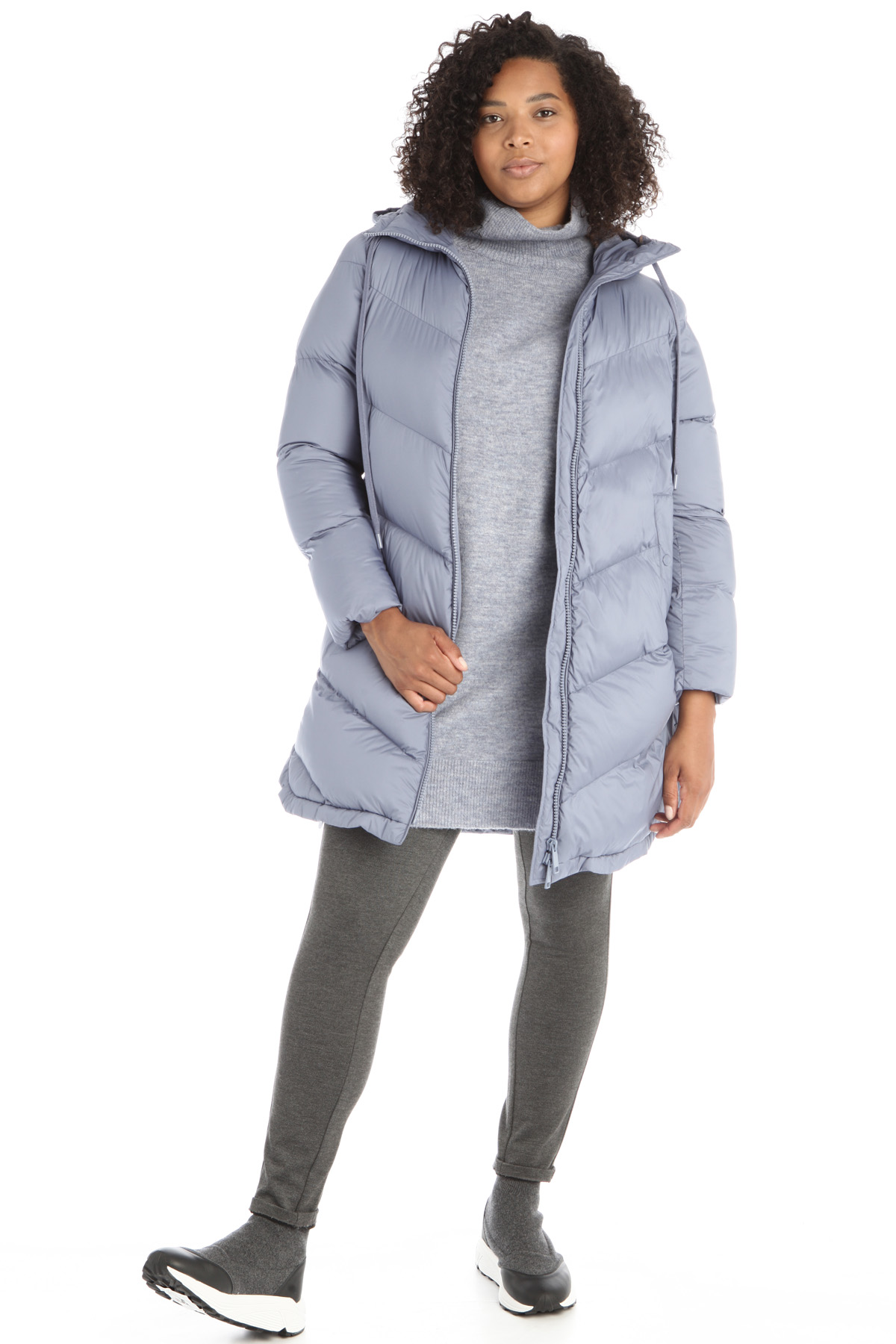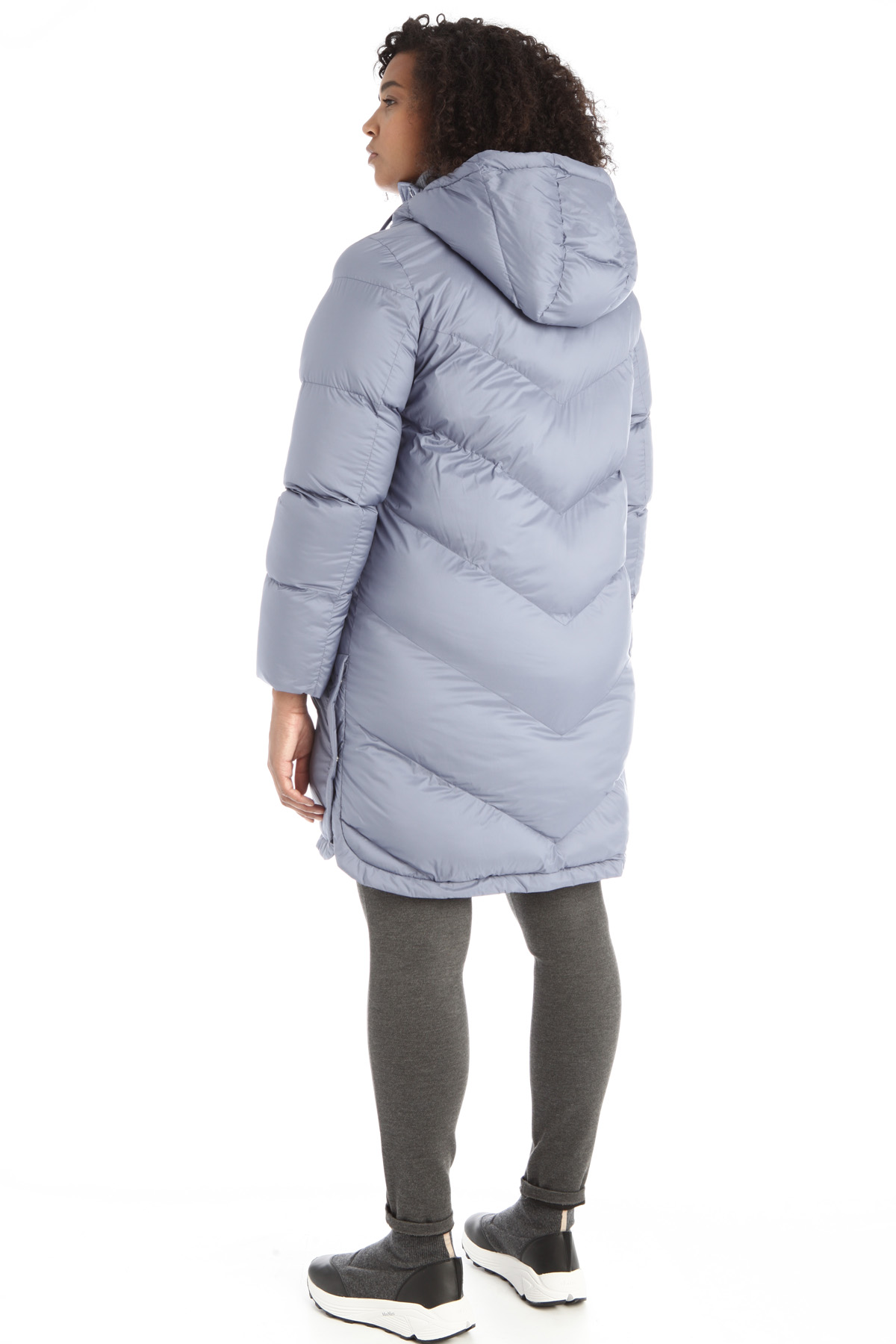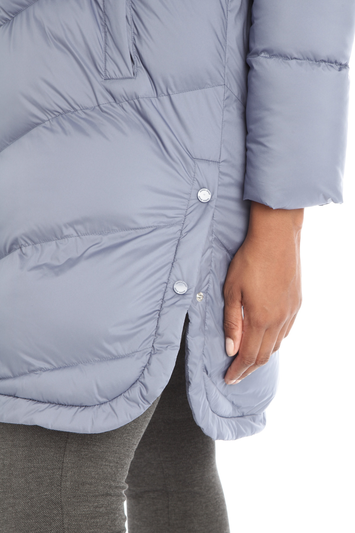 Imbottito lungo dalla linea svasata realizzato in tessuto tecnico trapuntato antigoccia dal finish opaco con cappuccio e coulisse, maniche lunghe, tasche a filetto e spacchi sui lati con bottoni automatici. Allacciatura tramite zip a doppio cursore.