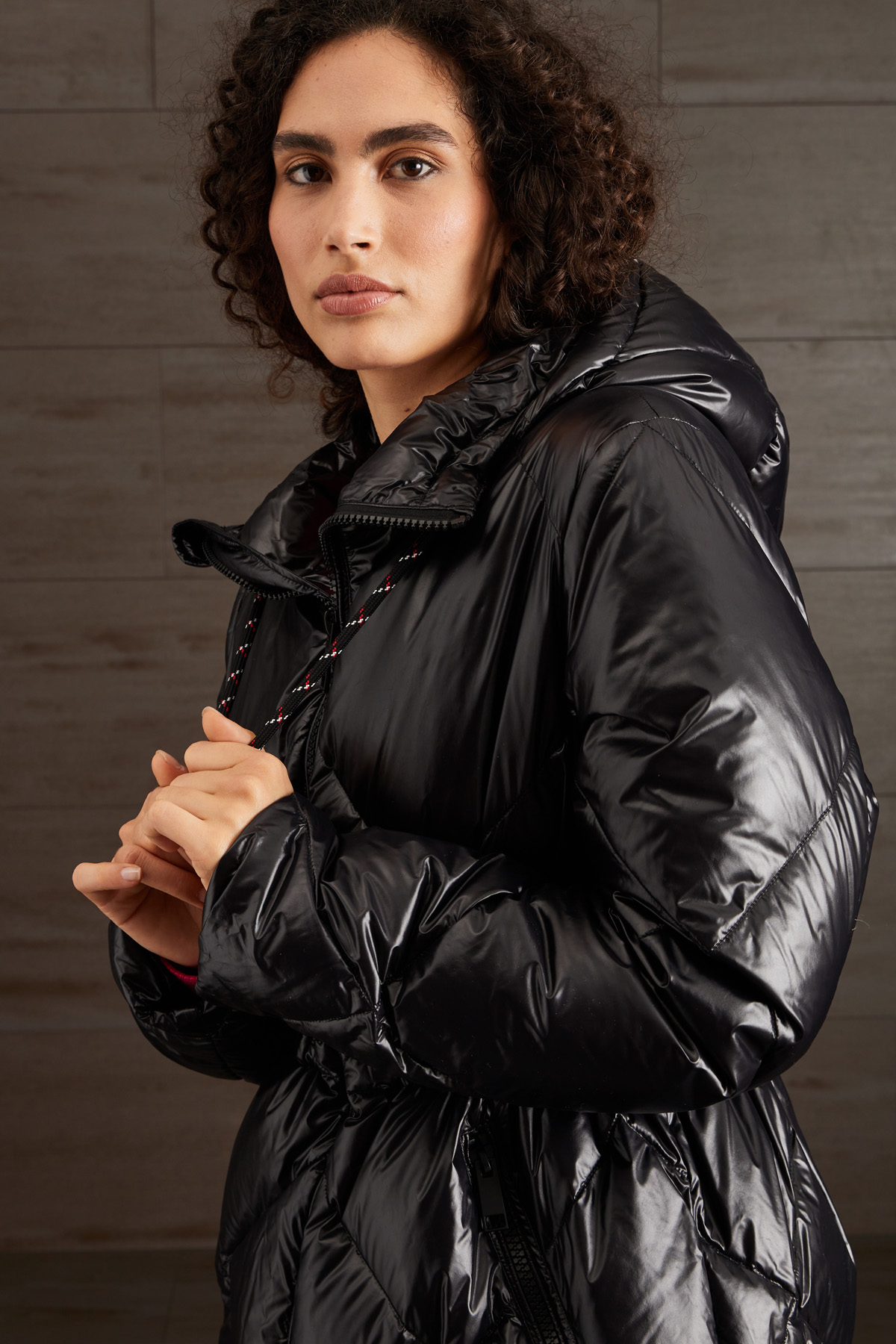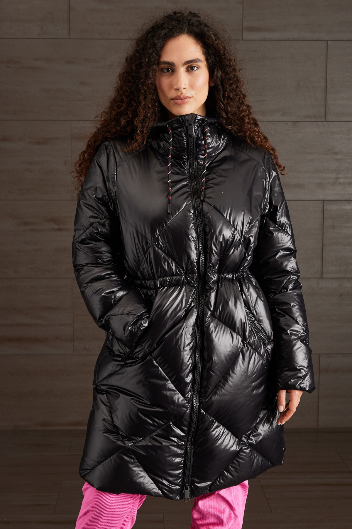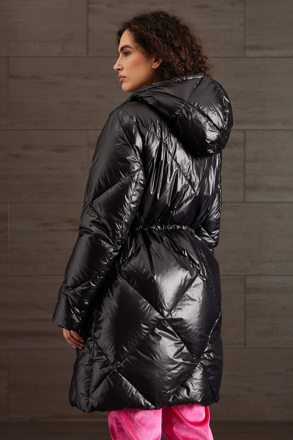 Piumino lungo dalla linea dritta realizzato in raso tecnico trapuntato antigoccia, con cappuccio, coulisse al collo e in vita all'interno, maniche lunghe, tasche a doppio filetto con zip. Allacciatura tramite zip a doppio cursore.