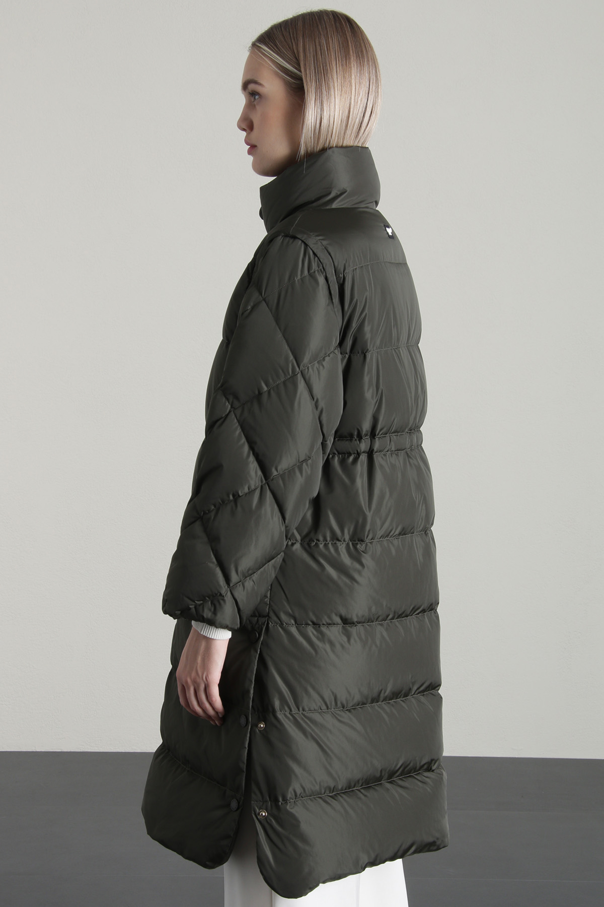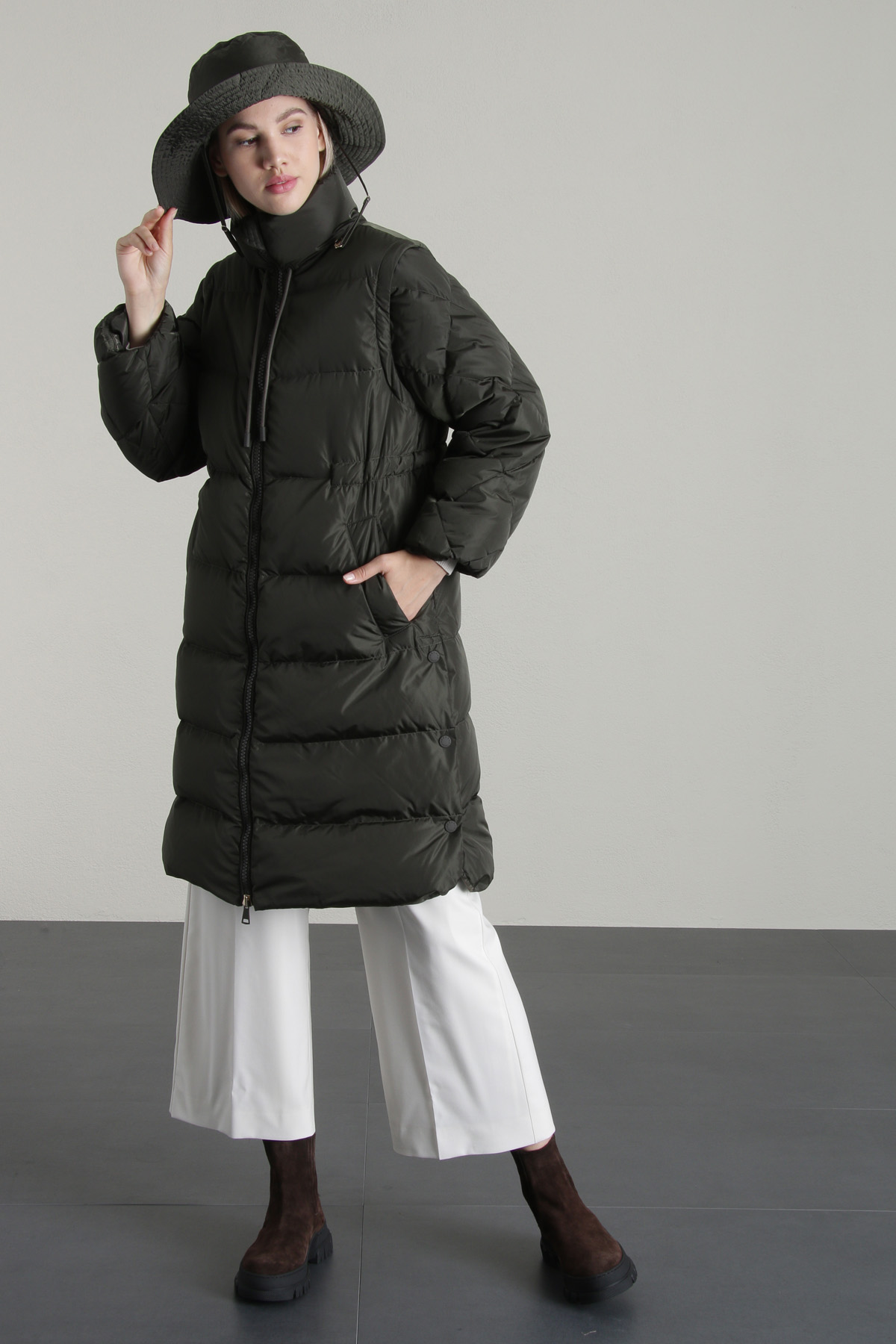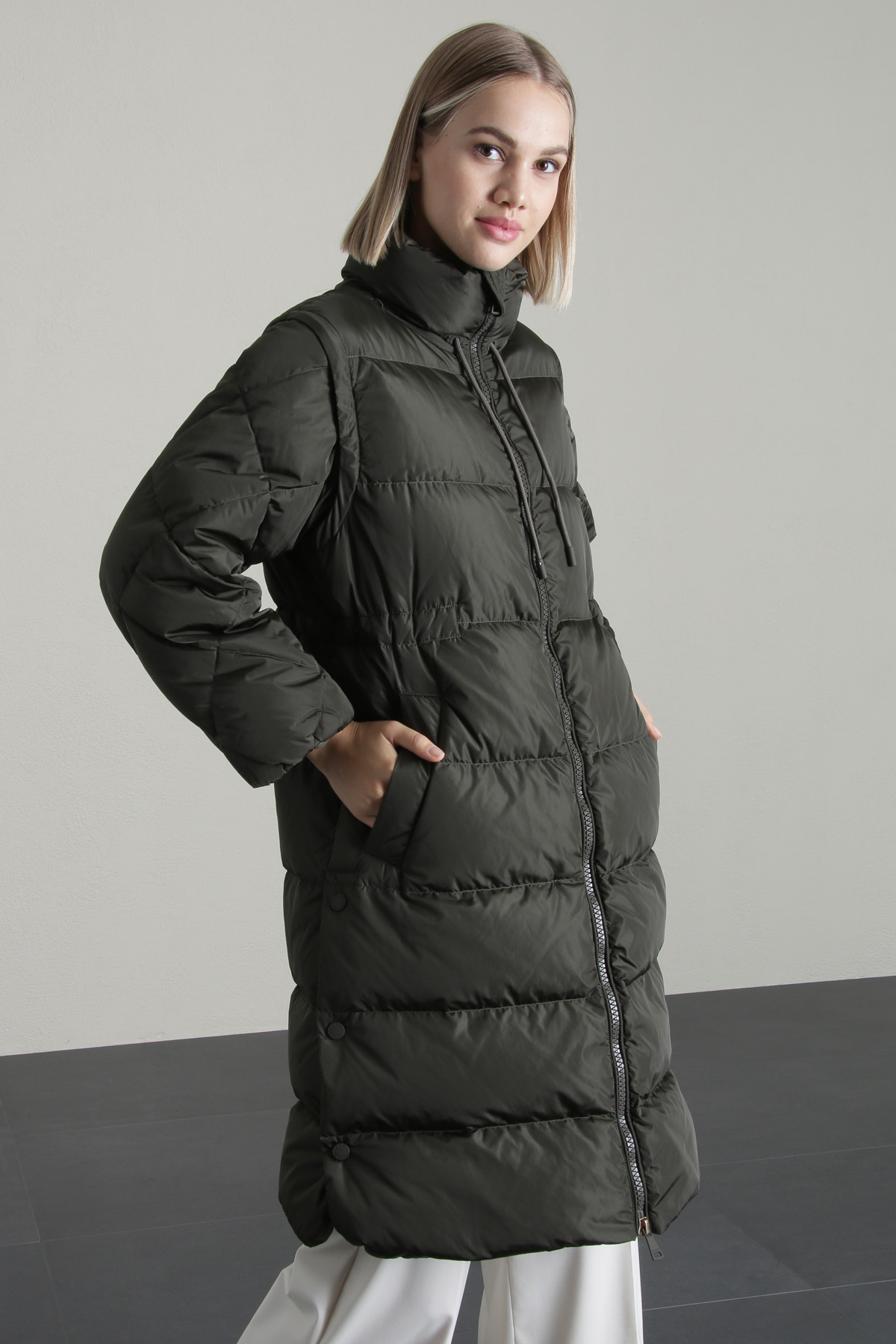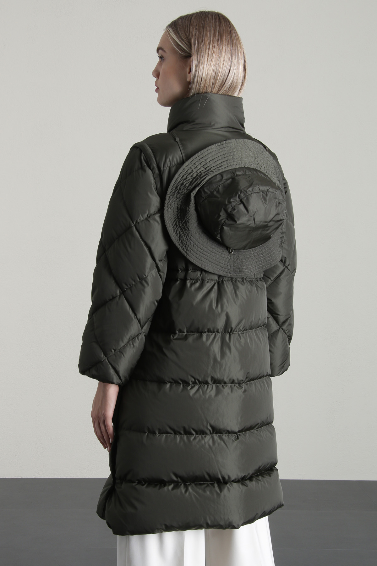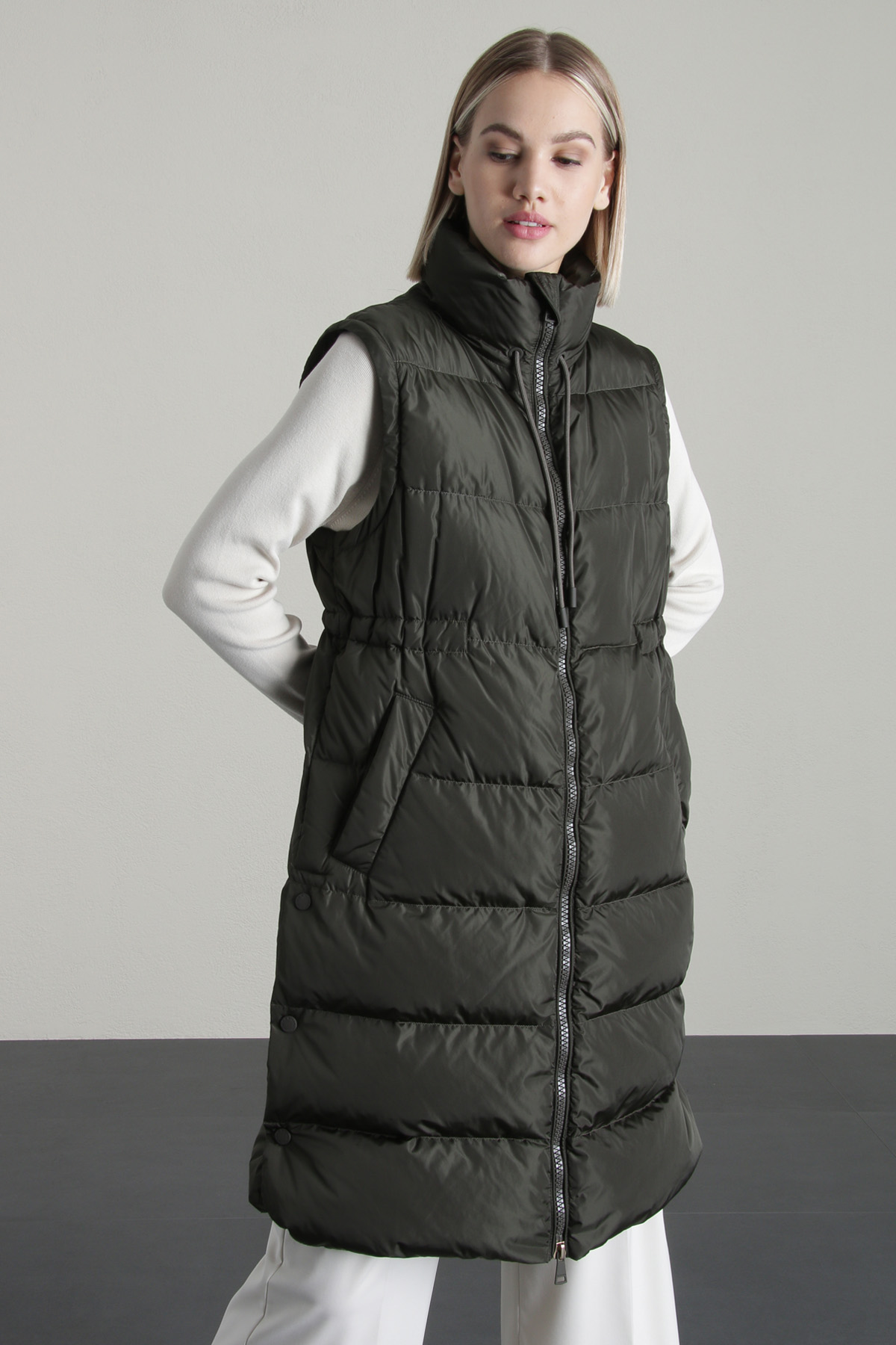 Piumino lungo realizzato in tessuto antigoccia trapuntato, con collo alto e coulisse, maniche lunghe removibili tramite zip, tasche a filettone con bottone, spacchi laterali apribili tramite bottoni automatici e allacciatura tramite zip. Capo dotato di cappello da pescatore removibile con coulisse.