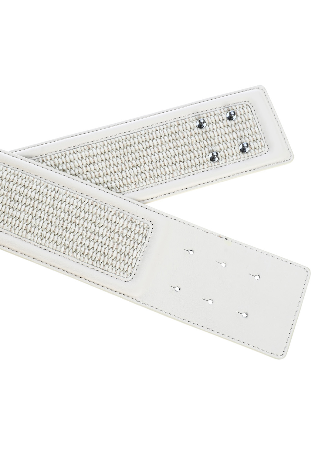 Cintura alta realizzata in rafia e vera pelle, con chiusura ad incastro.