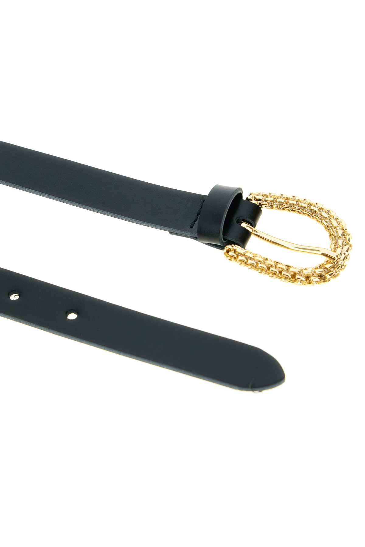 Cintura sottile realizzata in vera pelle, con fibbia in metallo rifinita da motivo a rilievo.