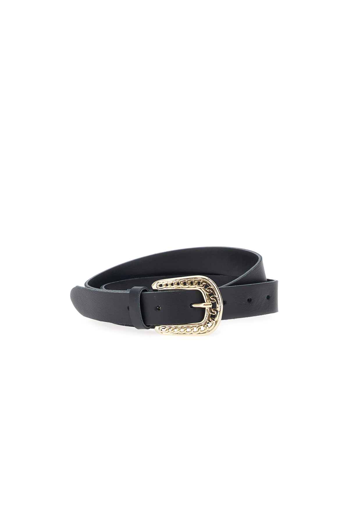 Cintura realizzata in vera pelle, fibbia in metallo con motivo a catena e passante.