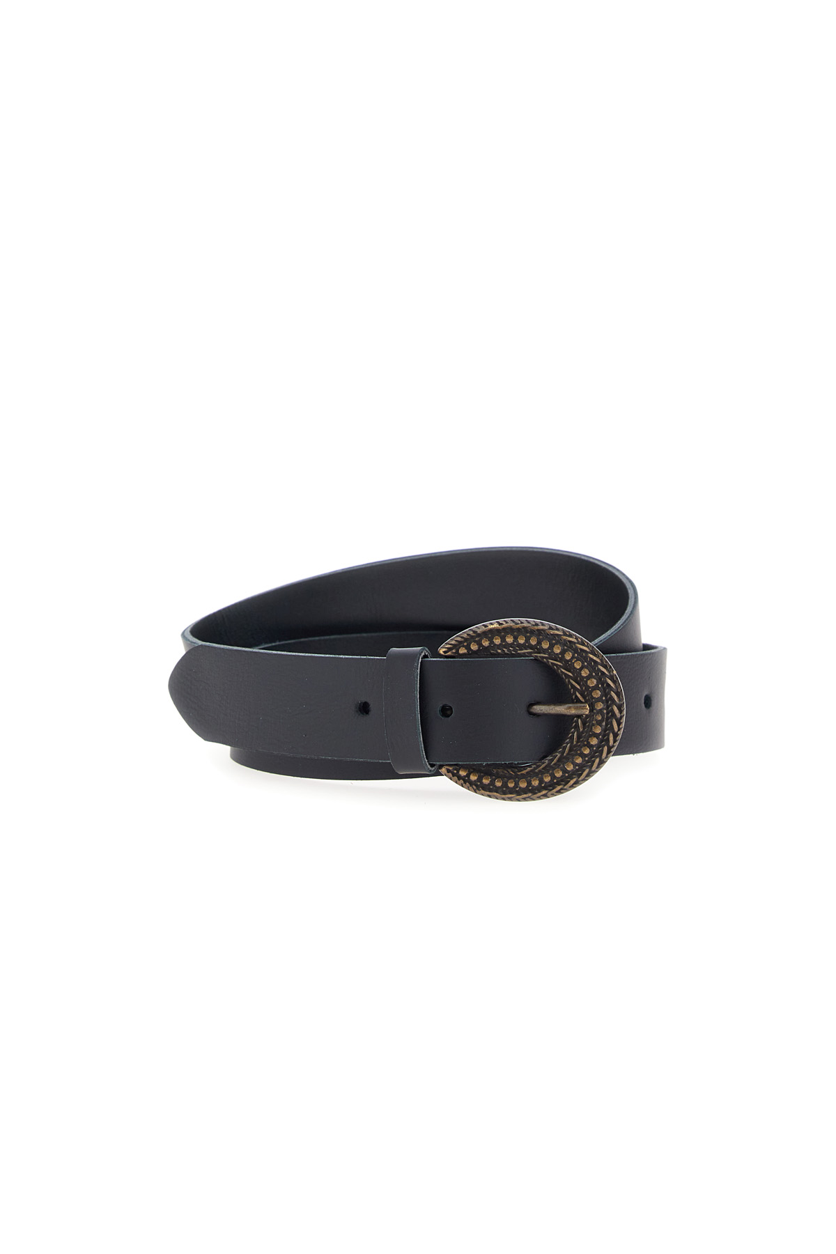 Cintura realizzata in vera pelle con fibbia metallica intarsiata e passante.