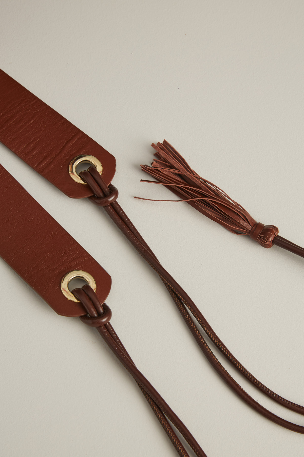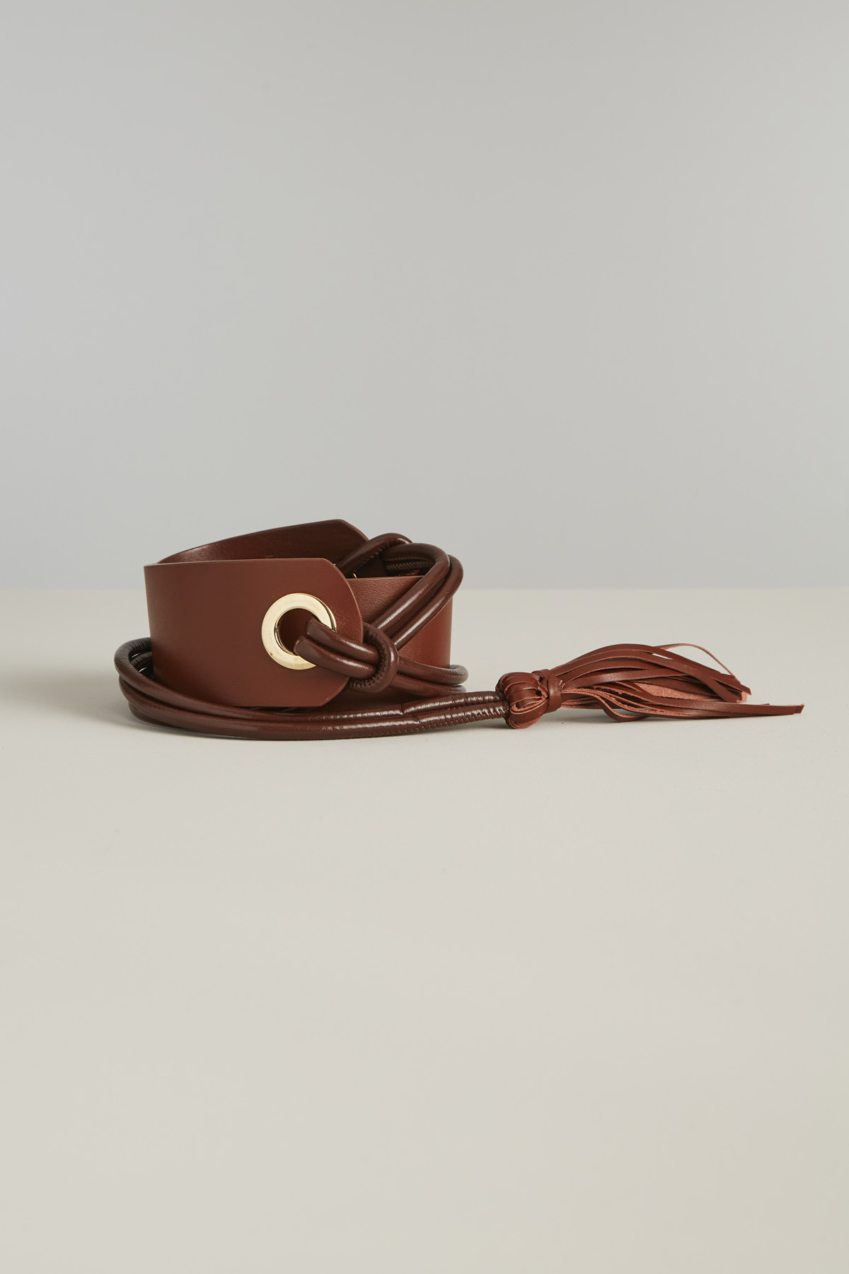 Cintura realizzata in vera pelle con dettaglio di laccetti, nappine e occhielli in metallo e chiusura tramite nodo.