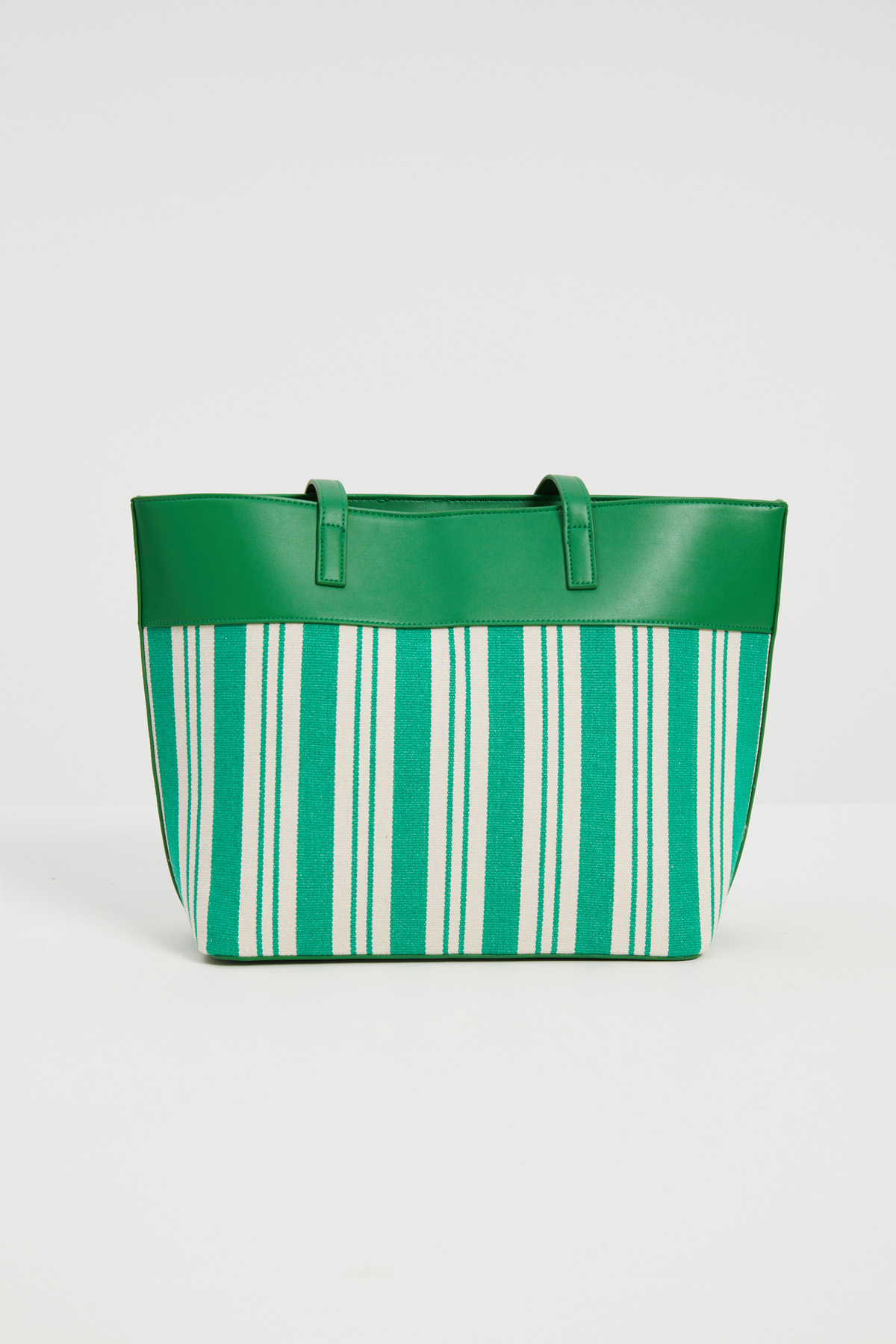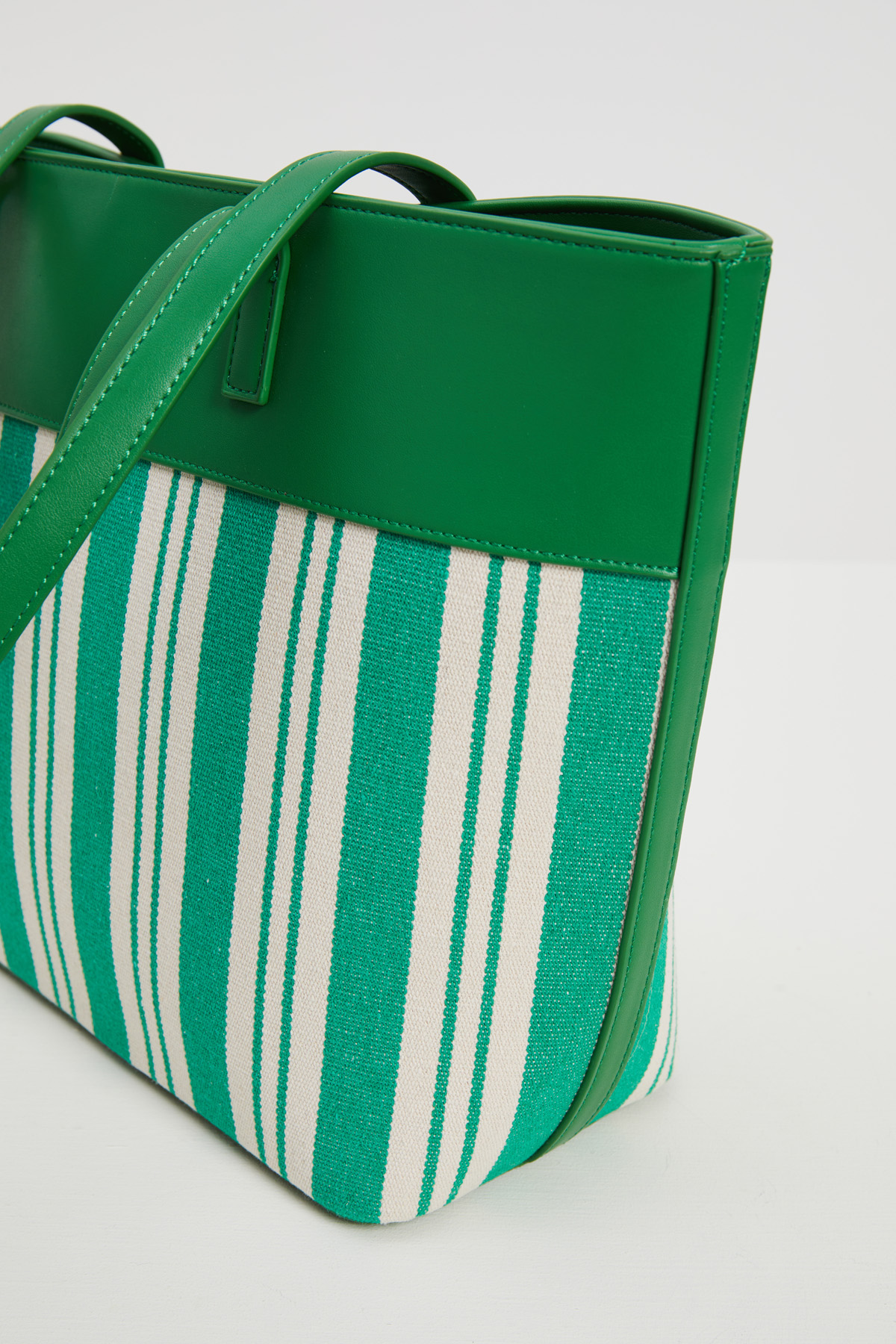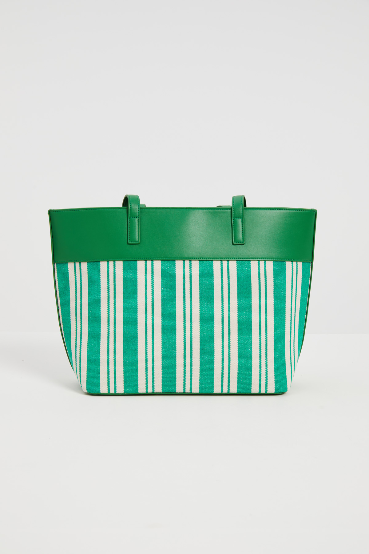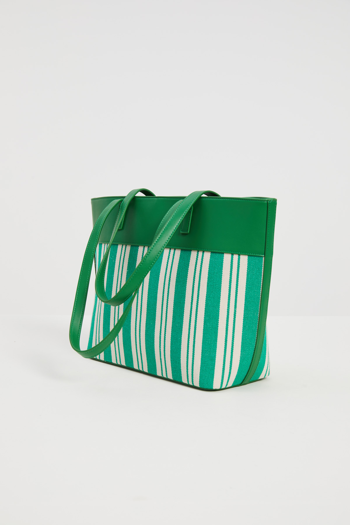 Shopper rigida realizzata in tela di misto cotone tinto filo con inserti in similpelle, con doppio manico. Interno foderato con taschini e zip. Chiusura tramite bottone a calamita.