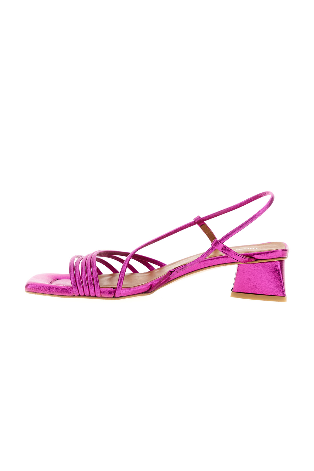 Sandali realizzati in vera pelle dal finish laminato, con listini sottili, punta quadrata e tacco geometrico.