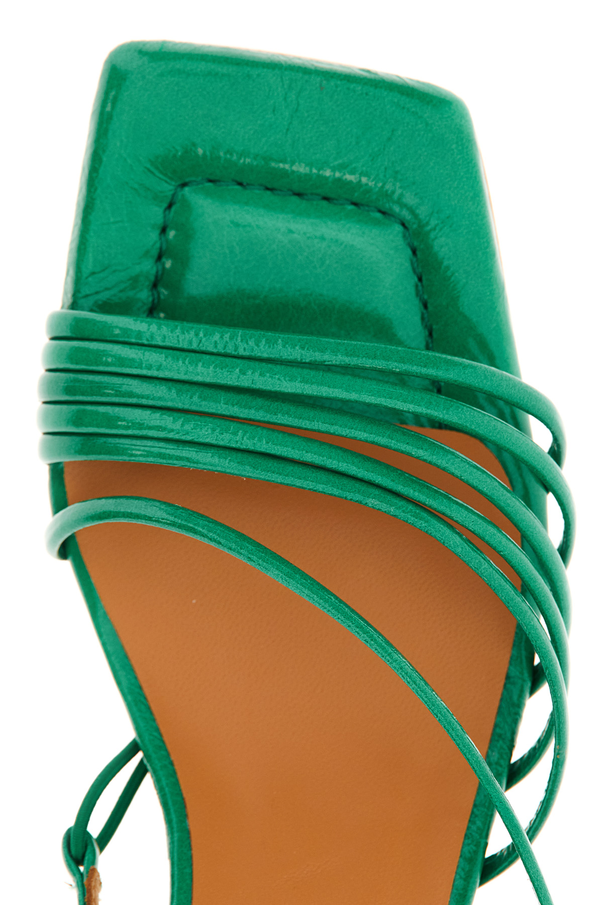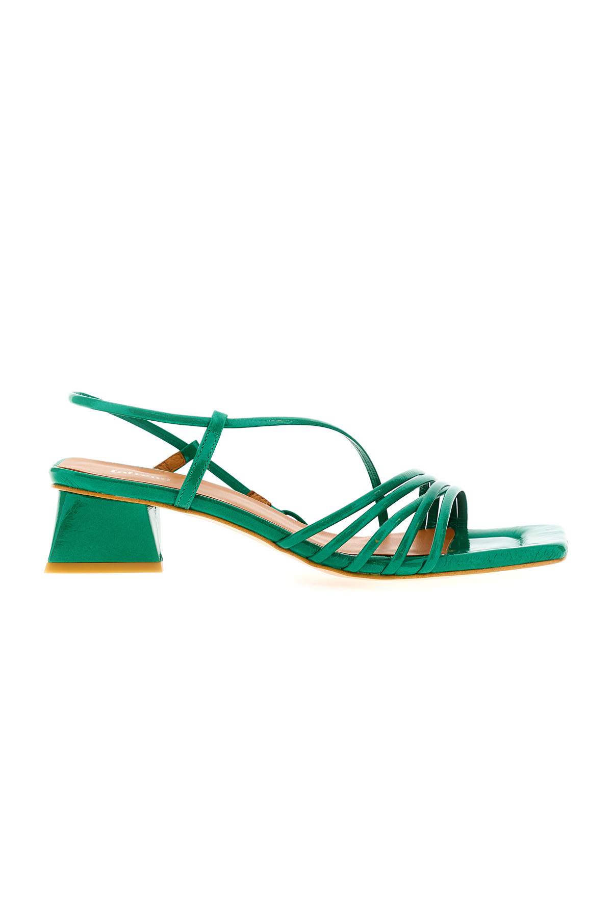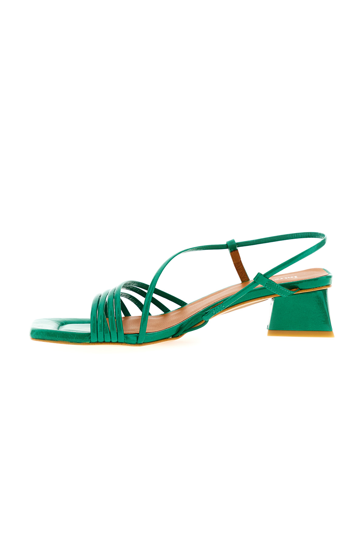 Sandali realizzati in vera pelle dal finish lucido, con listini sottili, punta quadrata e tacco geometrico.
