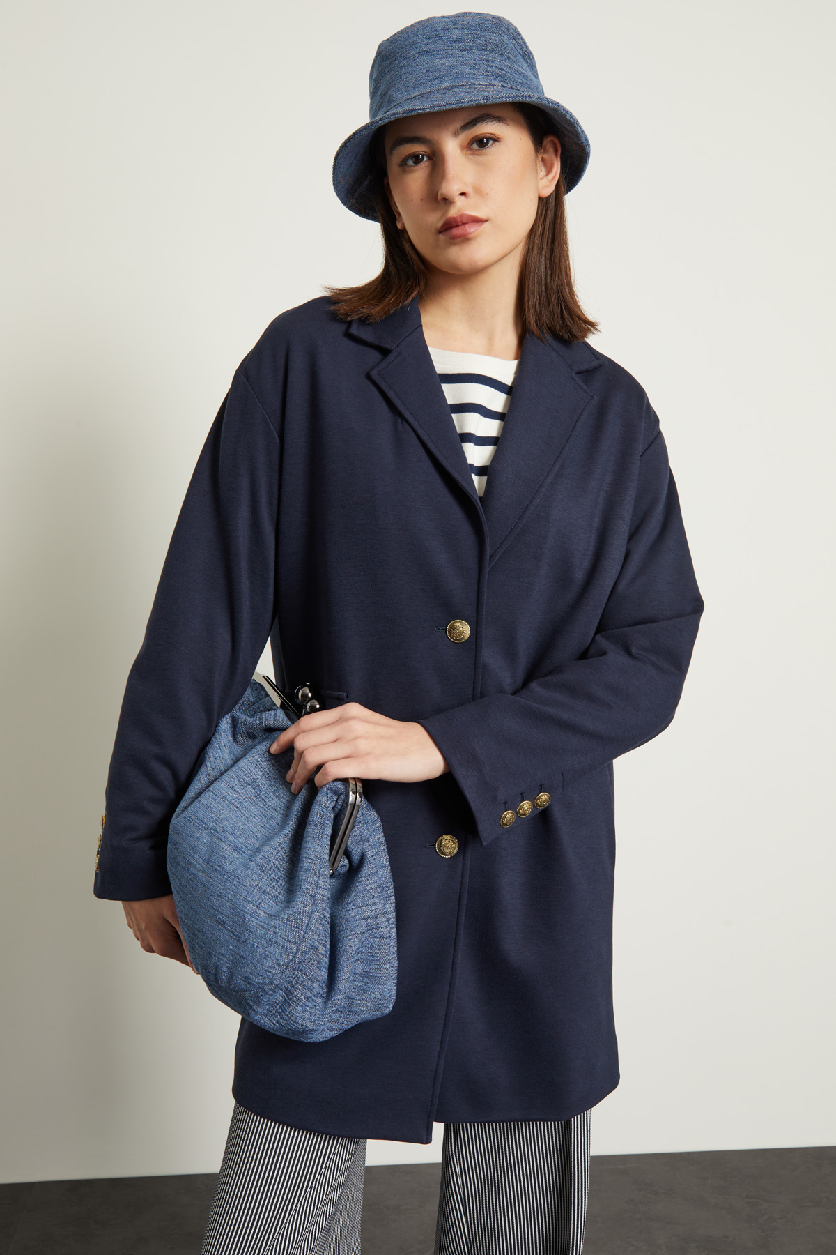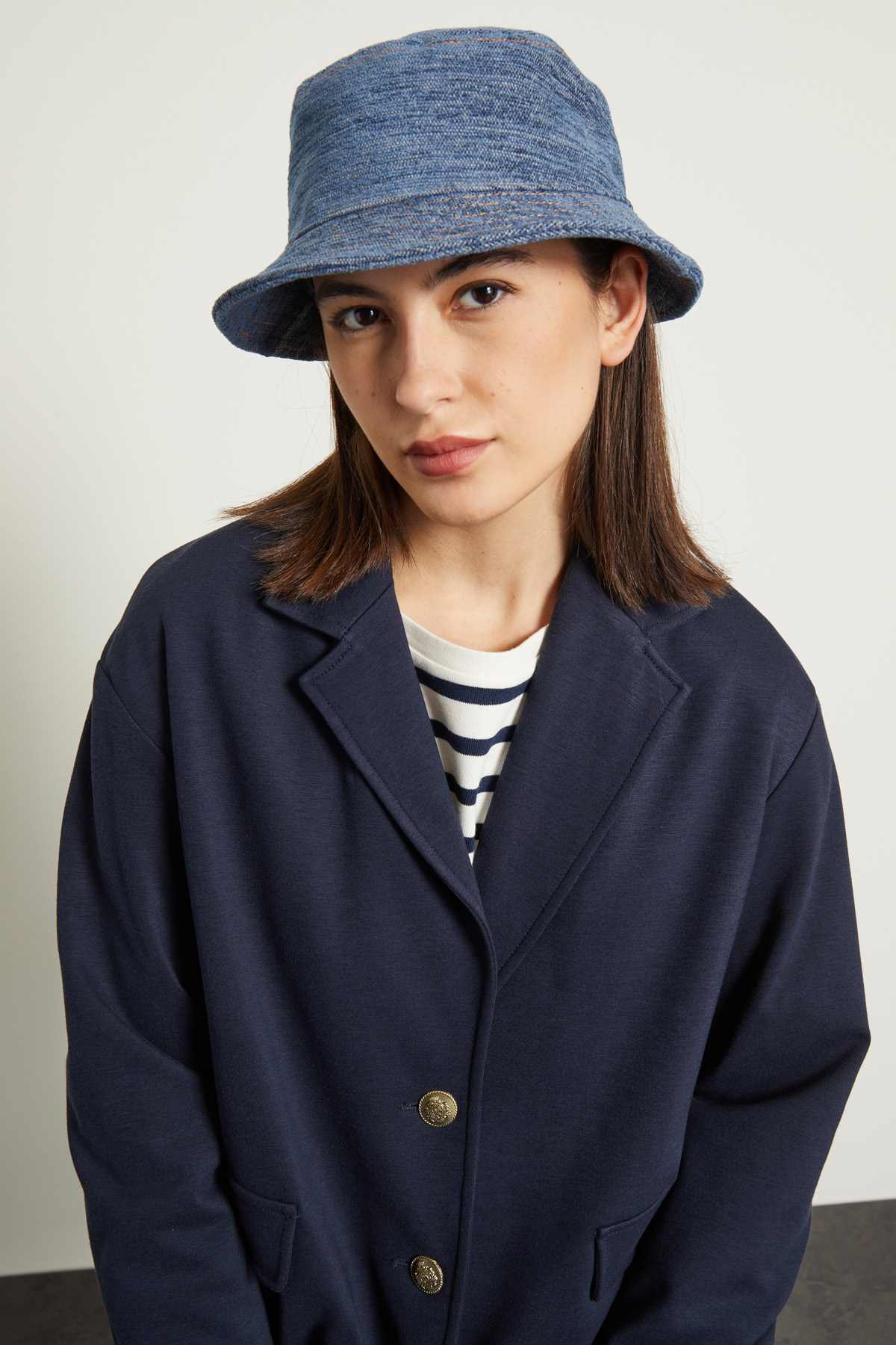 Cappello da pescatore realizzato in misto cotone effetto denim con impunture sulla tesa.