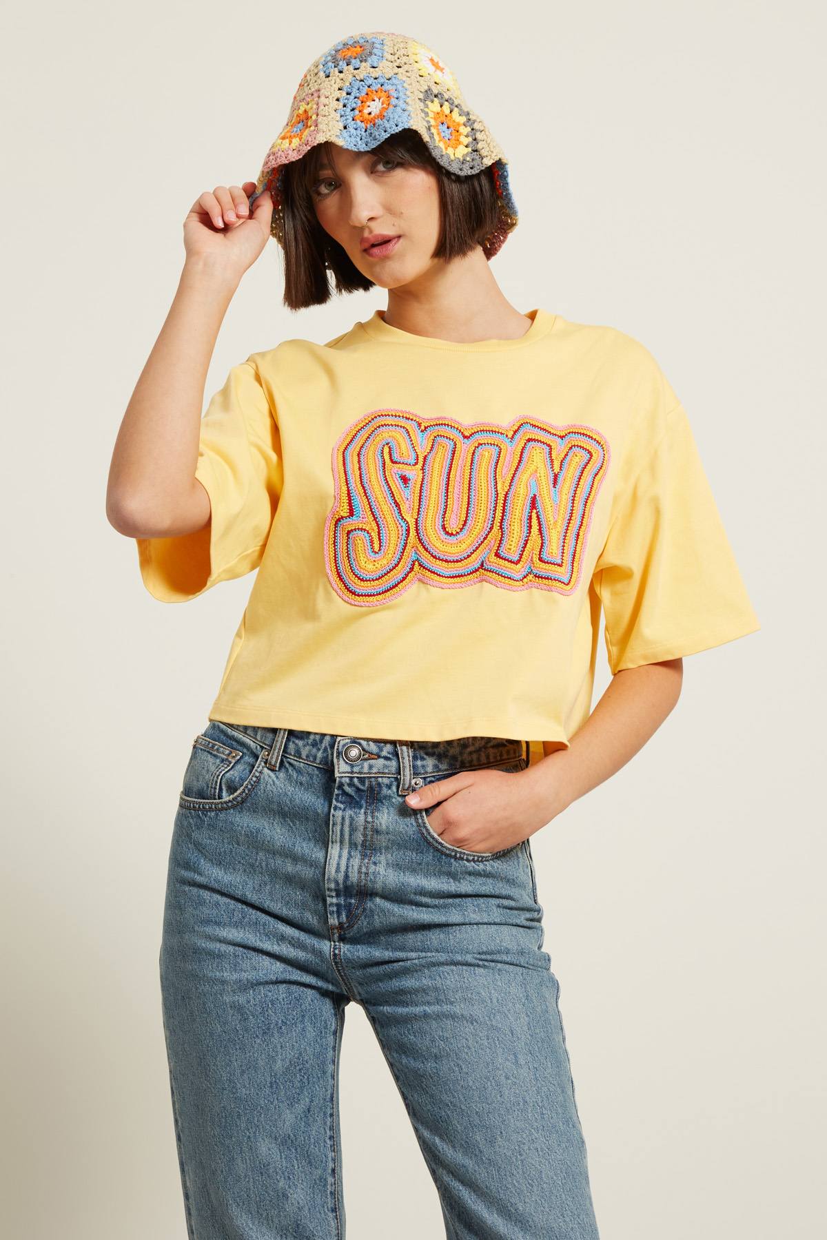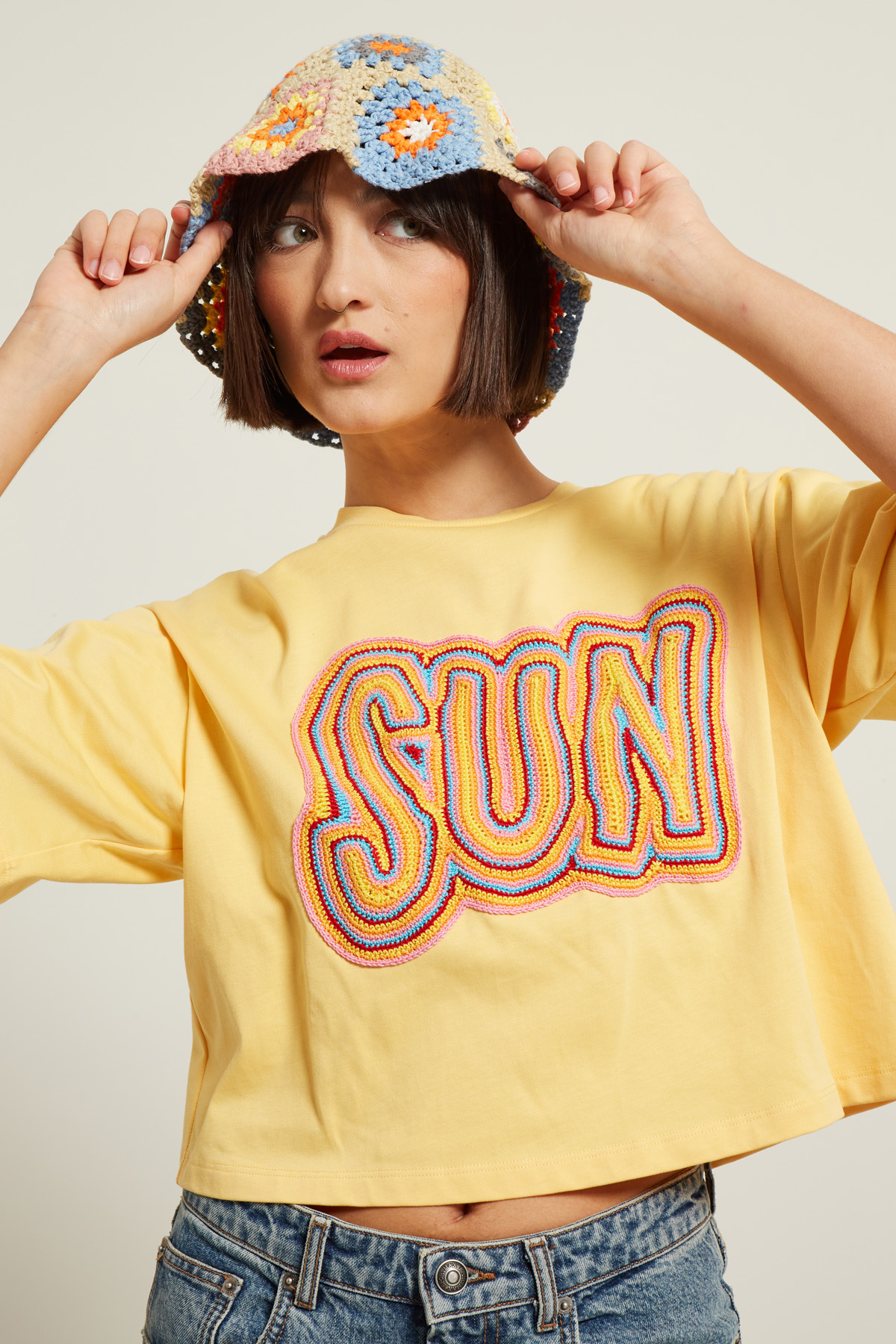 Cuffia morbida realizzata in filato con lavorazione all'uncinetto.