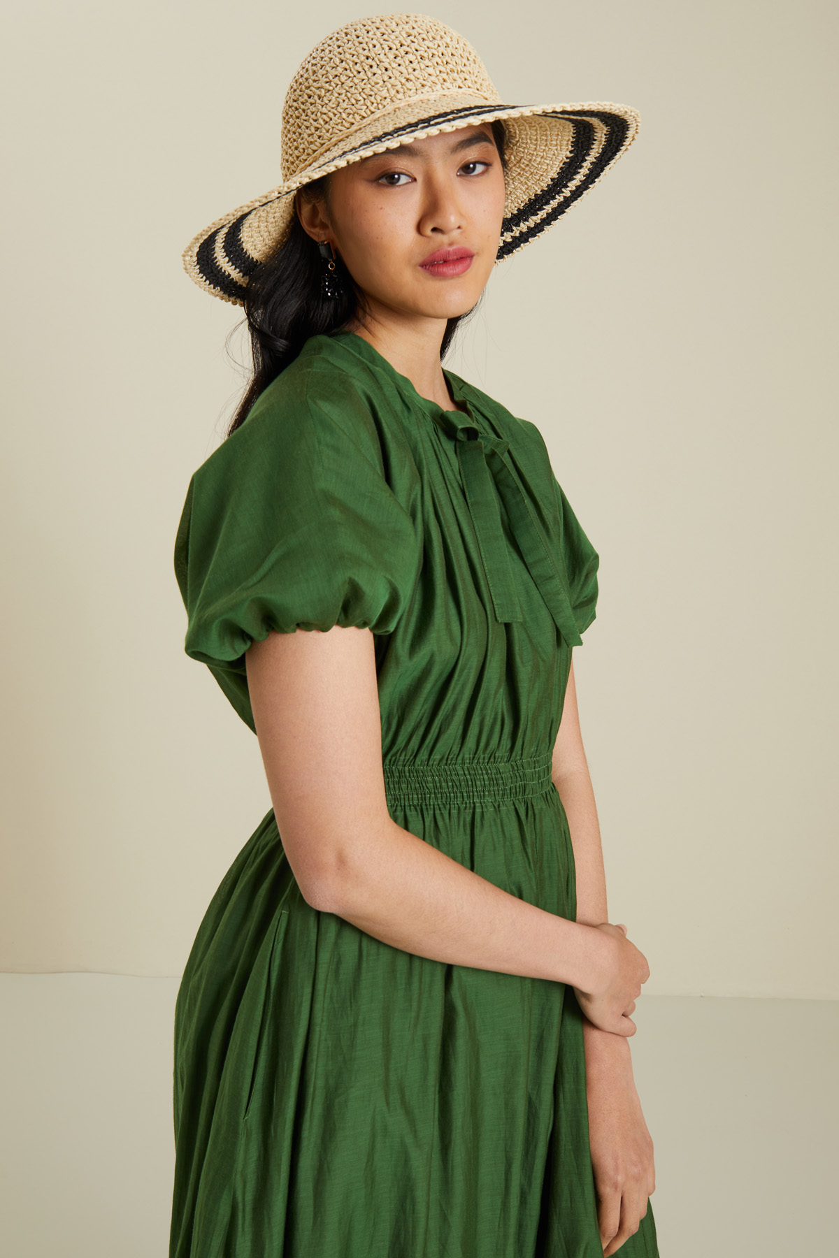 Cappello a tesa larga realizzato in rafia intrecciata tinto filo, con cupola arrotondata e dettaglio di nastro annodato a fiocco. Coulisse interna.