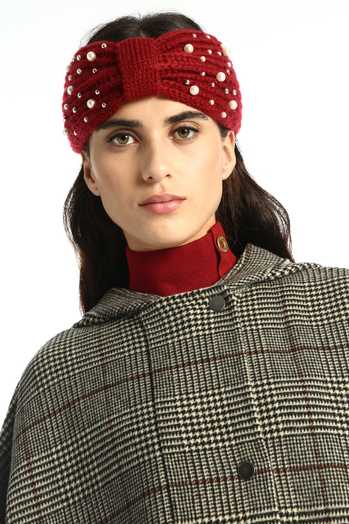 Fascia realizzata in maglia, con motivo a nodo e perle applicate.