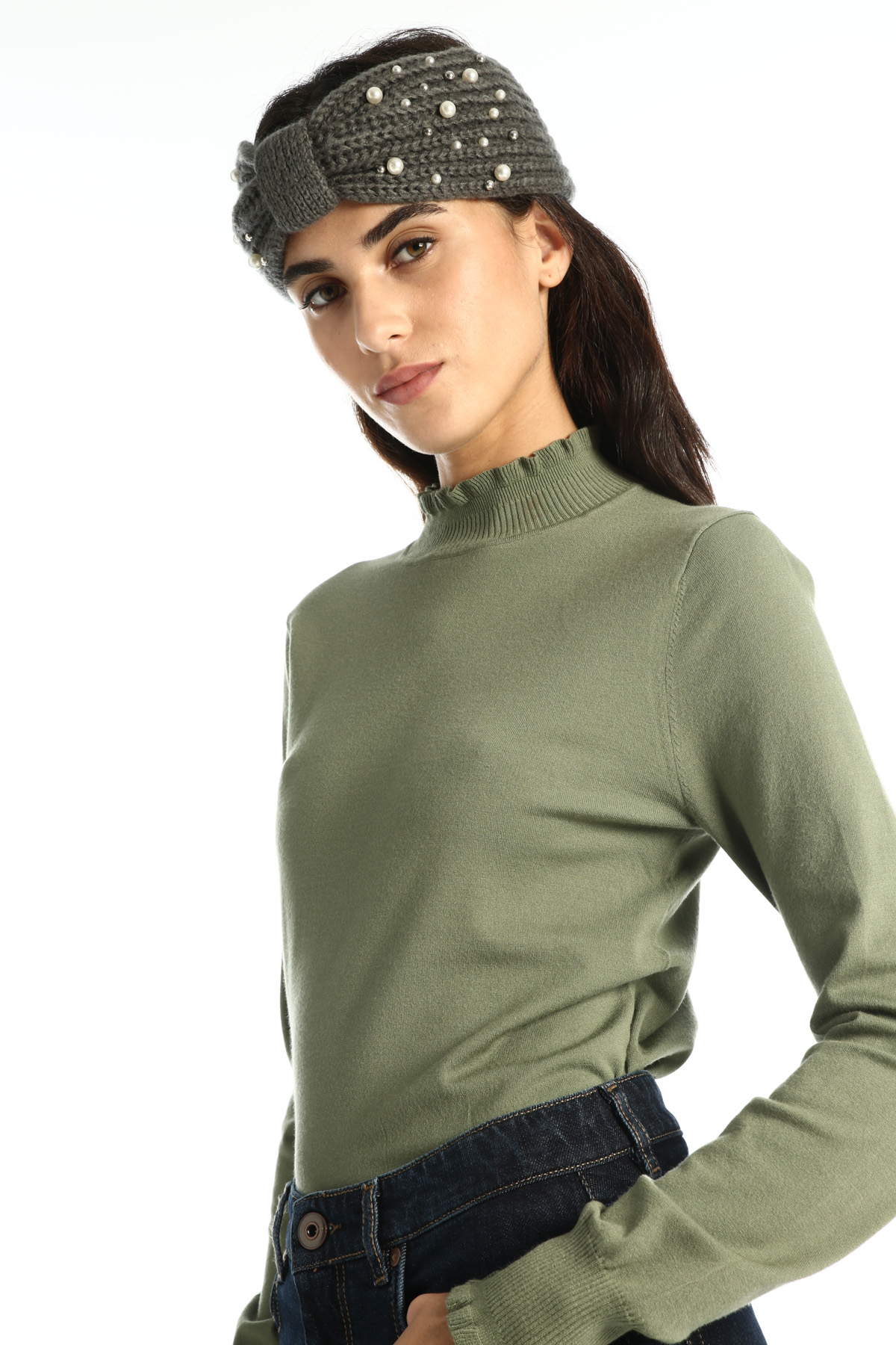 Fascia realizzata in maglia, con motivo a nodo e perle applicate.