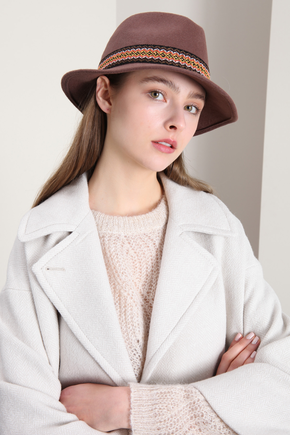 Cappello stile fedora realizzato in feltro di pura lana, con dettaglio in nastro fantasia.