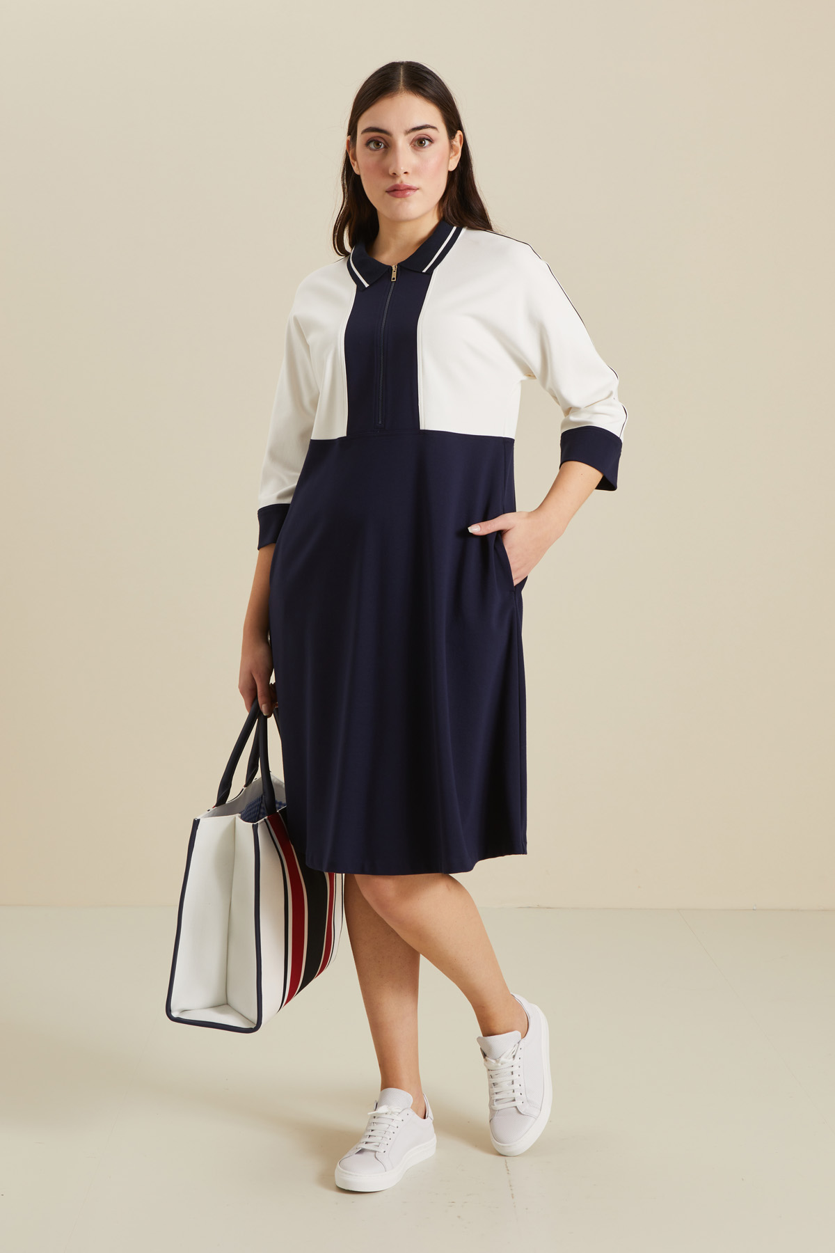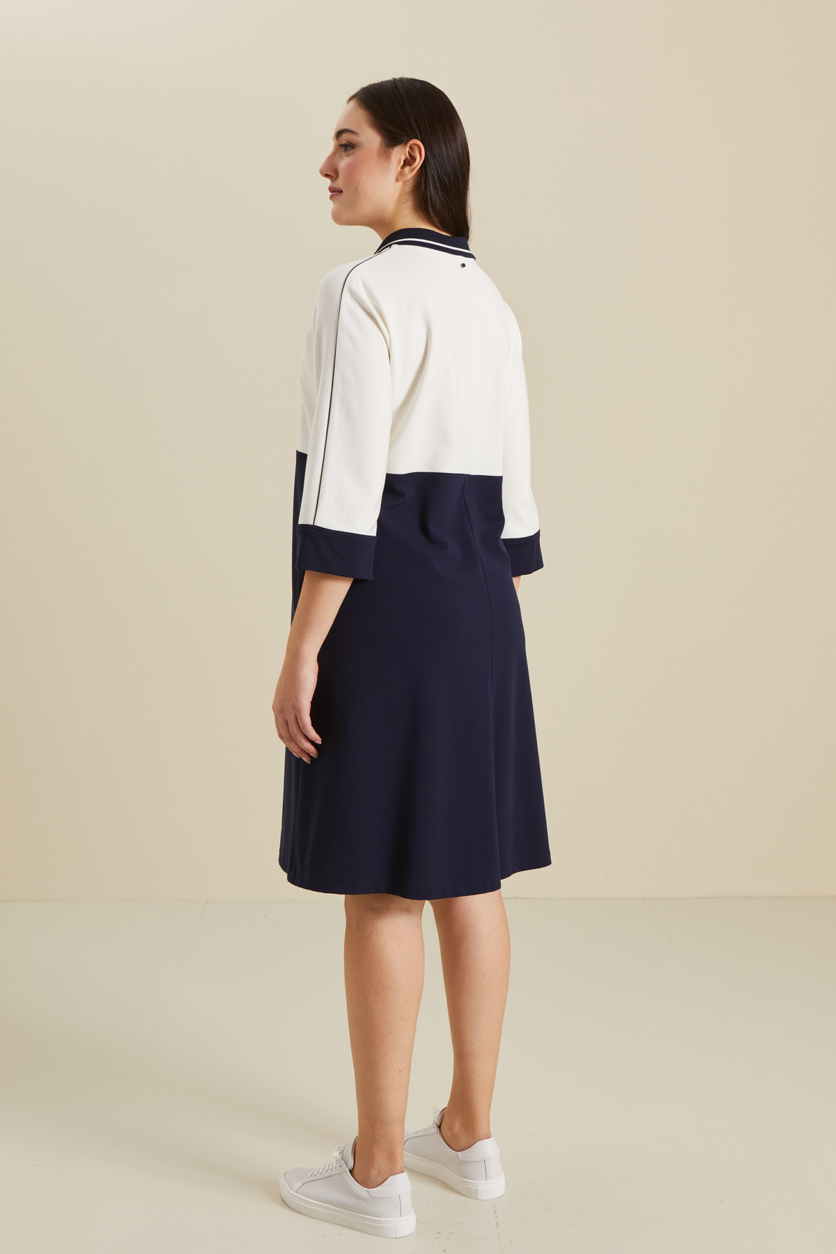 Abito dalla linea svasata realizzato in jersey compatto, con colletto a polo e apertura chiusa da zip, maniche a tre quarti e tasche laterali inserite in cucitura.
