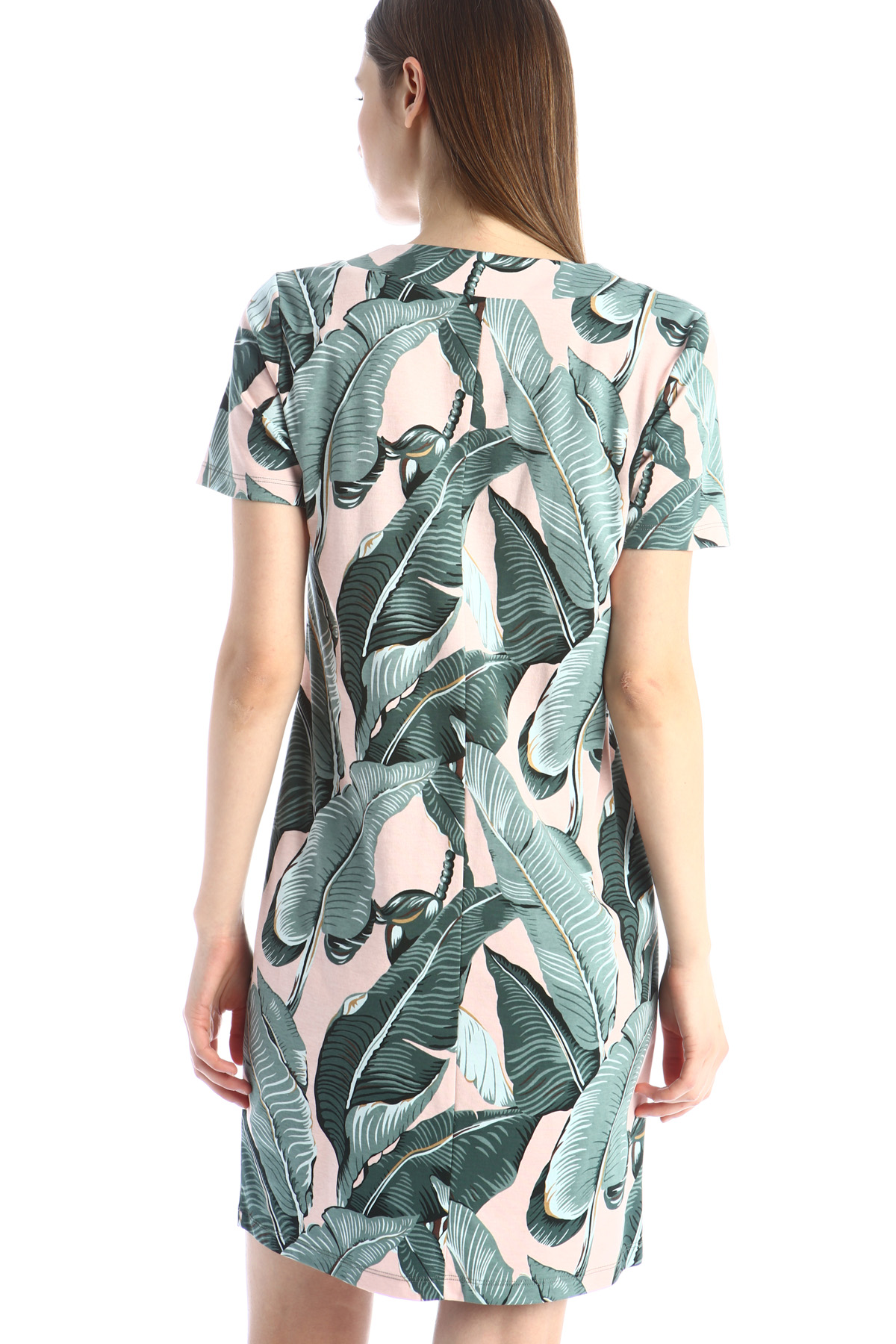Abito dalla linea dritta realizzato in jersey di puro cotone stampato all over, con scollo a V, maniche corte e piega ribattuta sul davanti.