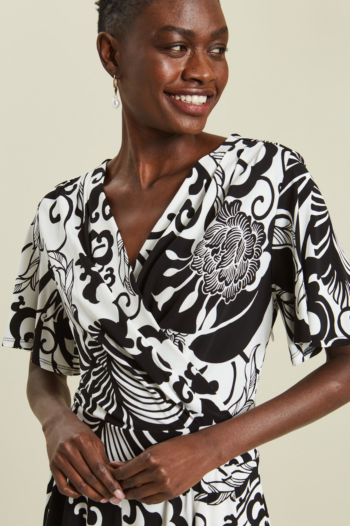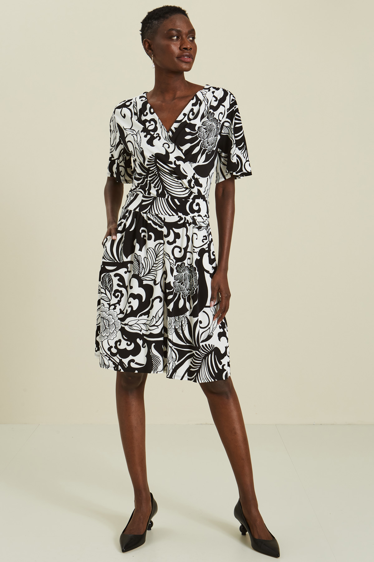 Tuta corta dalla linea morbida realizzata in jersey di viscosa crèpe stampata, con scollo a V drappeggiato, maniche corte volant, cintura in vita da annodare dietro e tasche laterali inserite in cucitura. Chiusura tramite zip invisibile su un fianco.